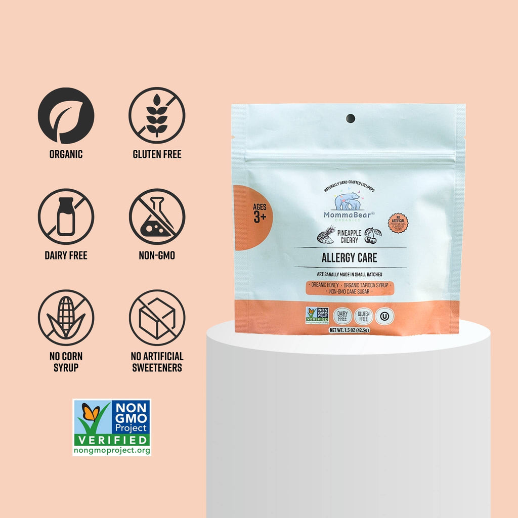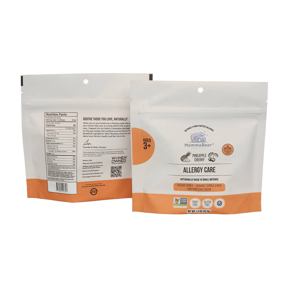Relieve allergy symptoms with Pineapple, Tart Cherry & Hibiscus lollipops, handcrafted in small batches using simple, organic ingredients. Perfect for on-the-go relief, these organic wildflower honey suckers naturally soothe discomfort and ease allergies. Enjoy a sweet, effective remedy anytime, anywhere.