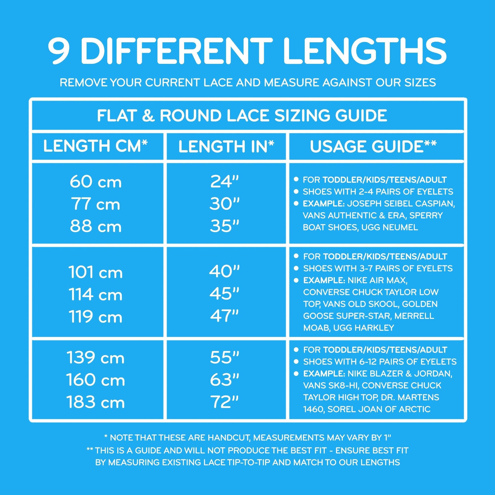 Flat laces measure 1/4 inch wide.
