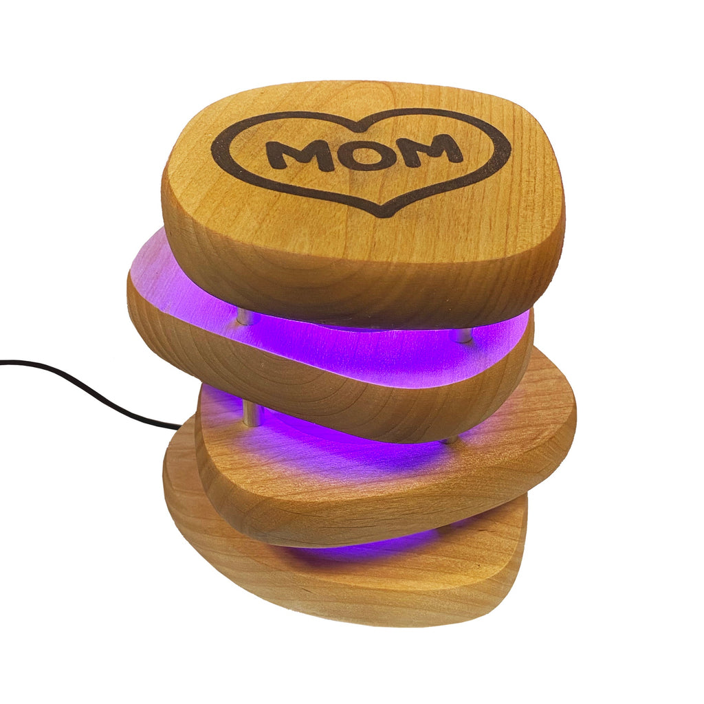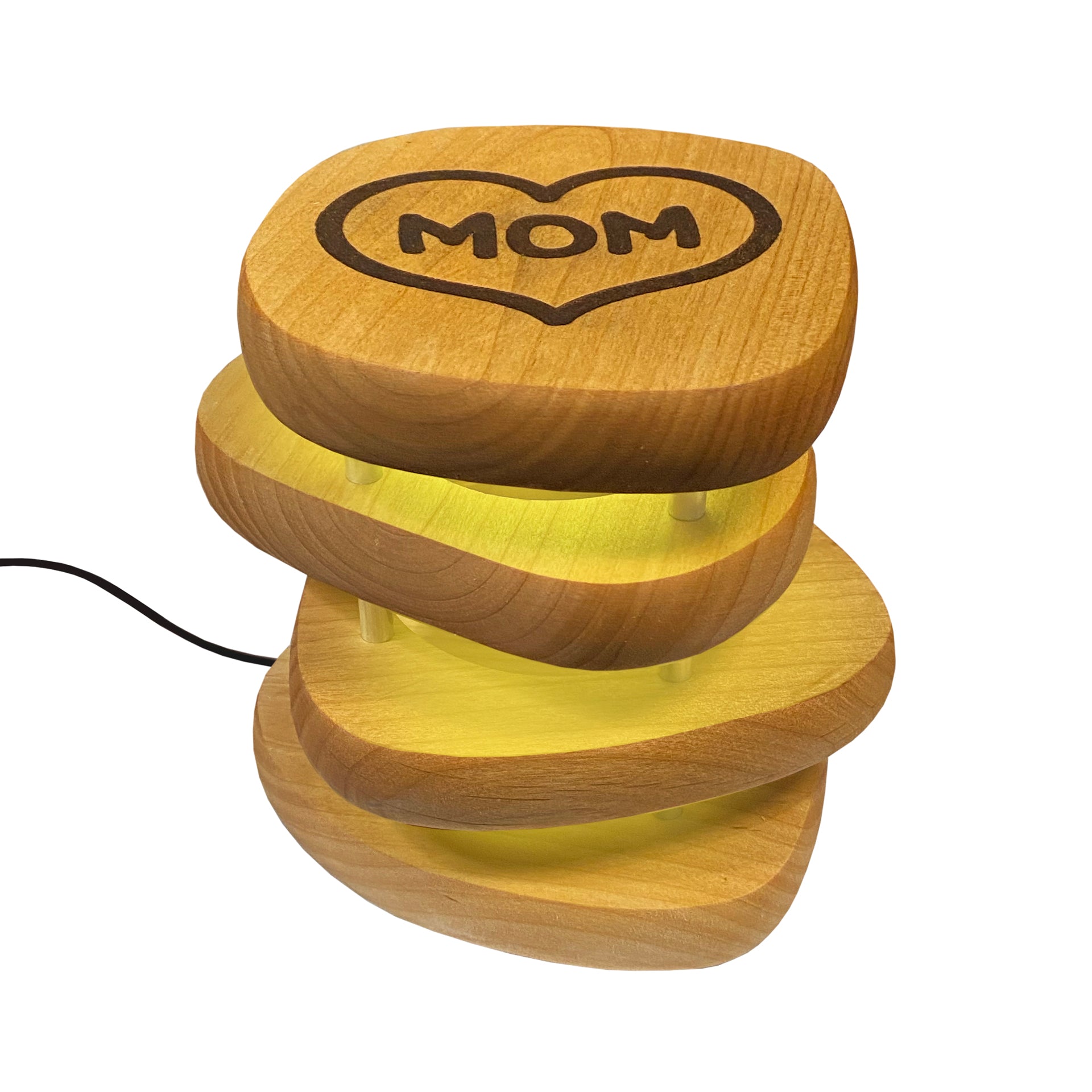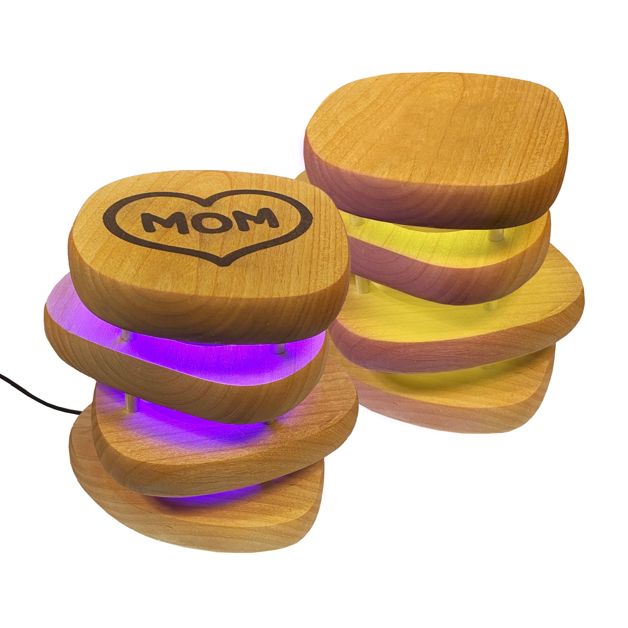 The Mid Century Friendship Lamp© is handcrafted and designed in Wichita, KS USA. The lamp is handmade out our of knotty alder wood. The knotty alder wood gives each lamp its very own unique look. Then stacked and connected with brushed aluminum adding to that modern style. Perfect Mother's Day gift with the heart mom design imprinted on the top. You can set a timer on the lamp illumination with default setting being 1.5 hours. You get to choose when the light will diminish in brightness in 30 minutes, 1.5 hours, 8 hours or 24 hours. All you need is Wi-Fi to easily connect.