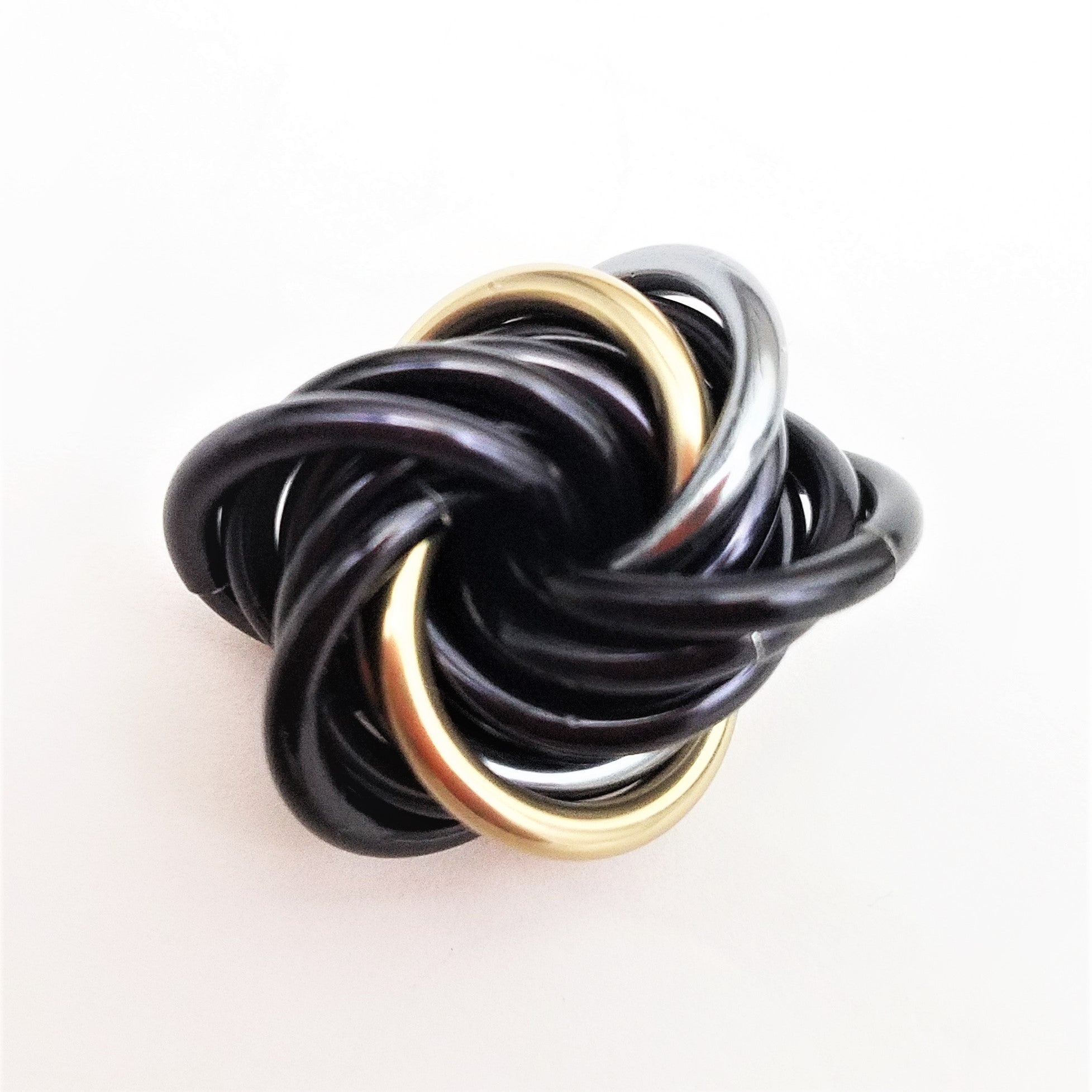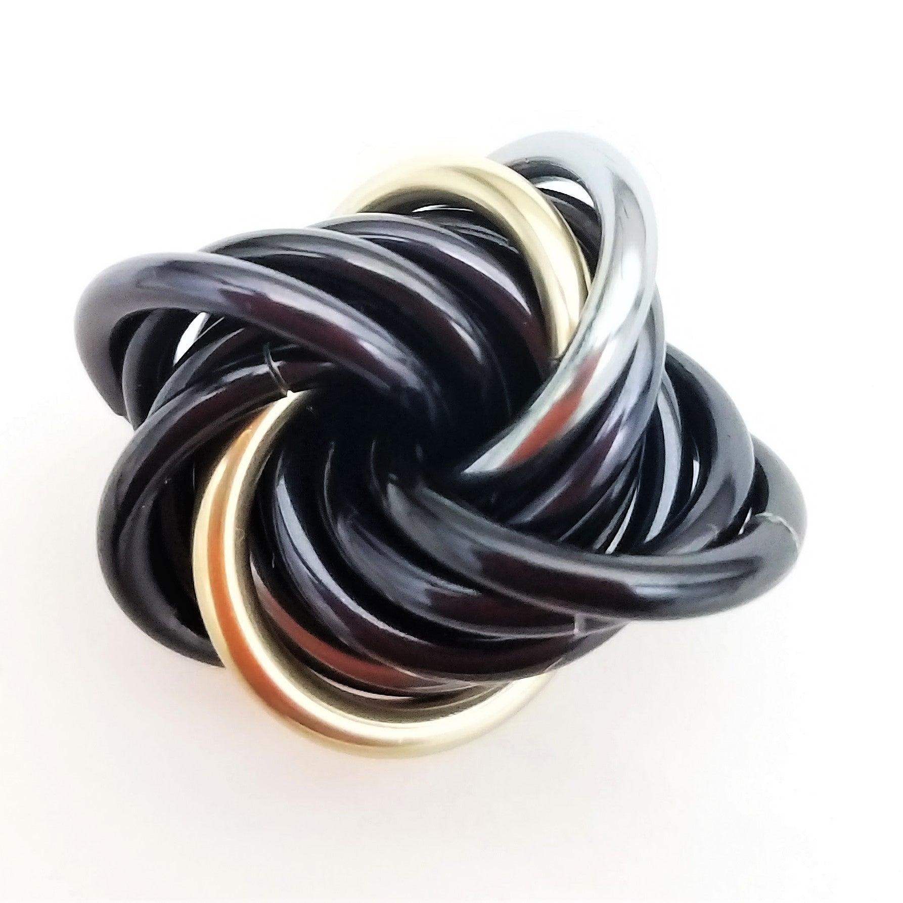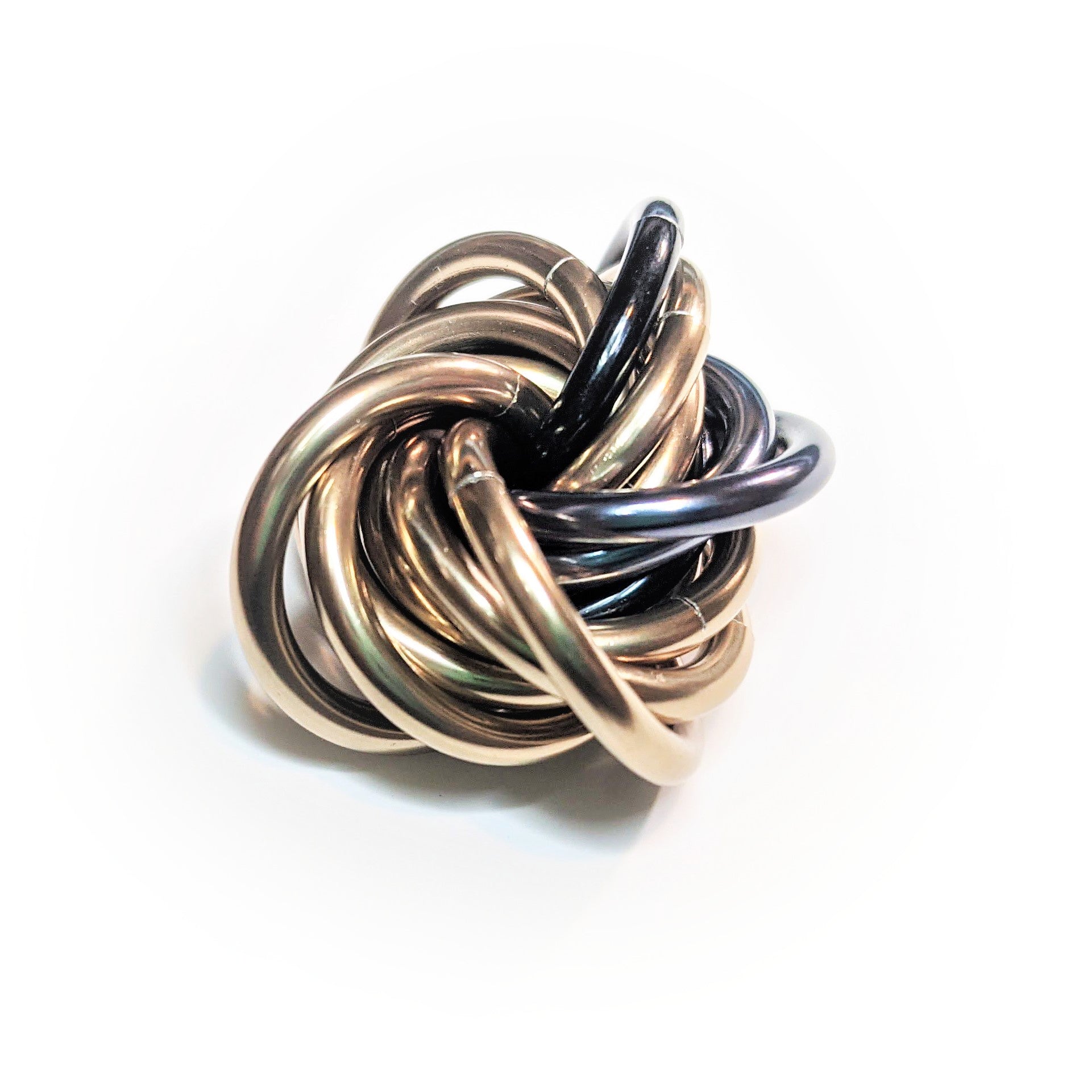 Rings are woven together so that you can rotate the rings through and spin this in your hand forever. The design cycles back in on itself so it goes on forever!