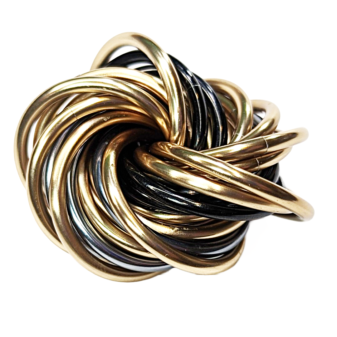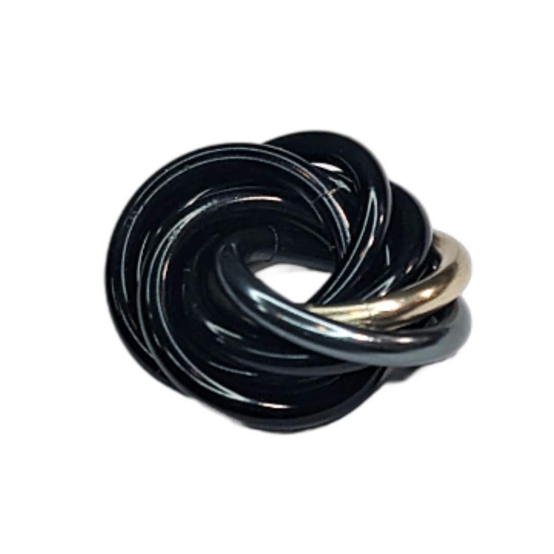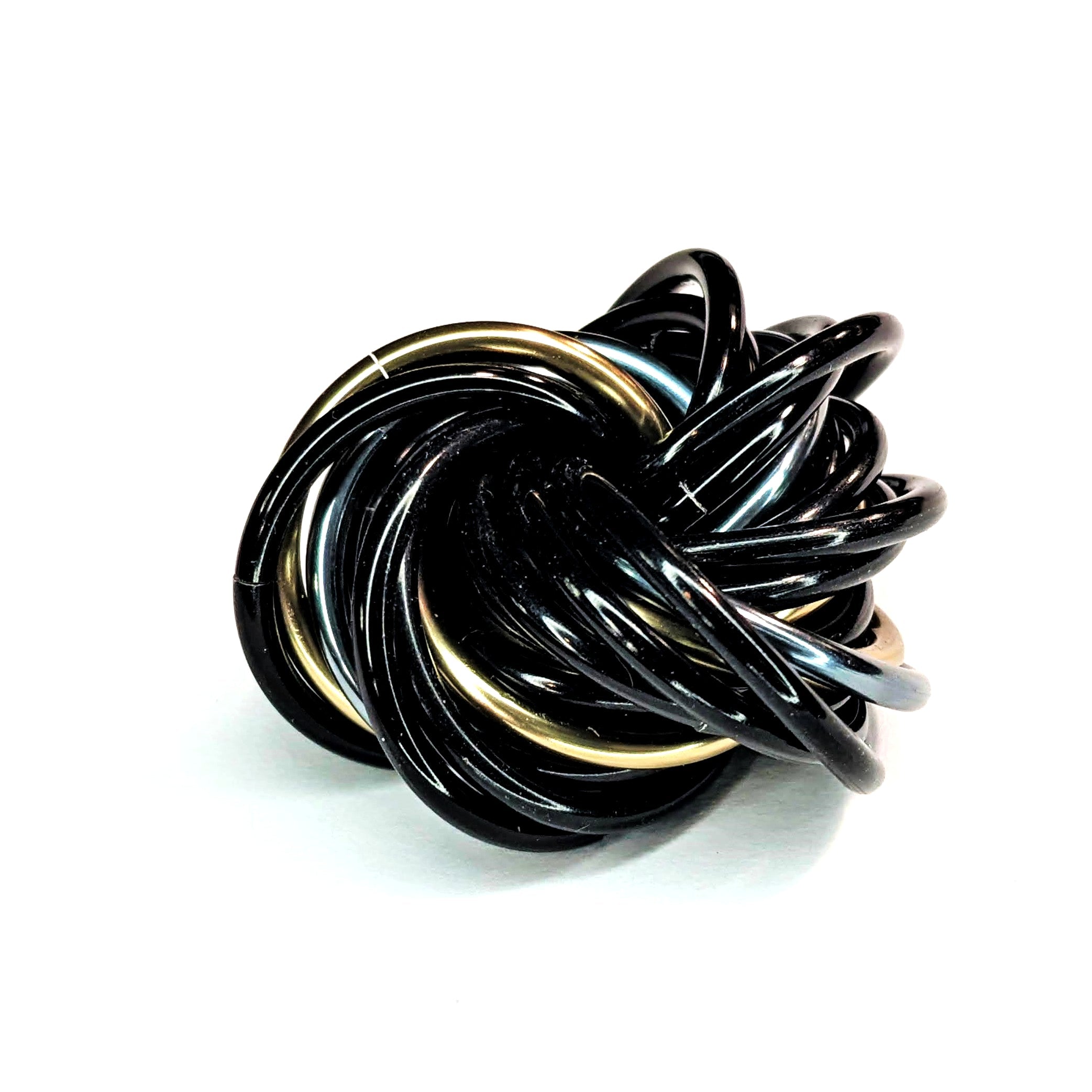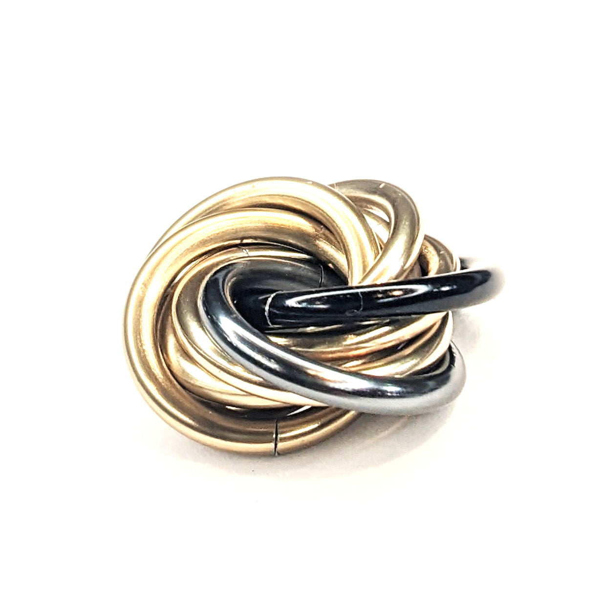 Rings are woven together so that you can rotate the rings through and spin this in your hand forever. The design cycles back in on itself so it goes on forever!