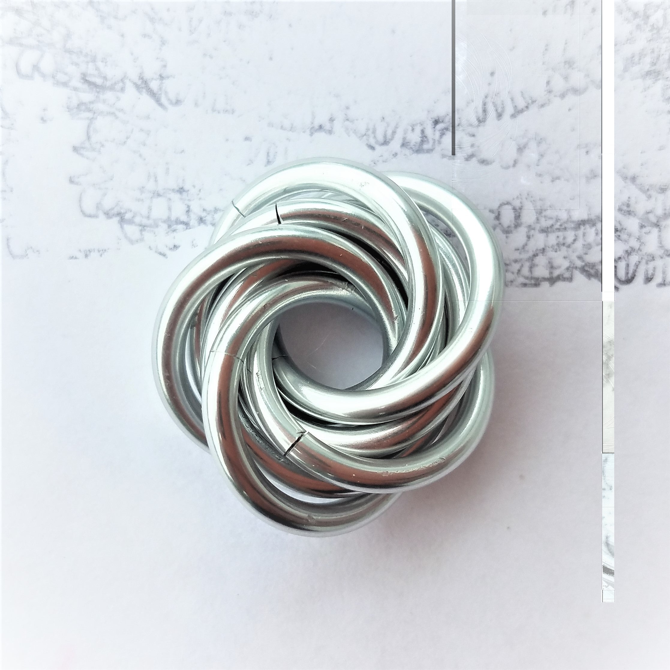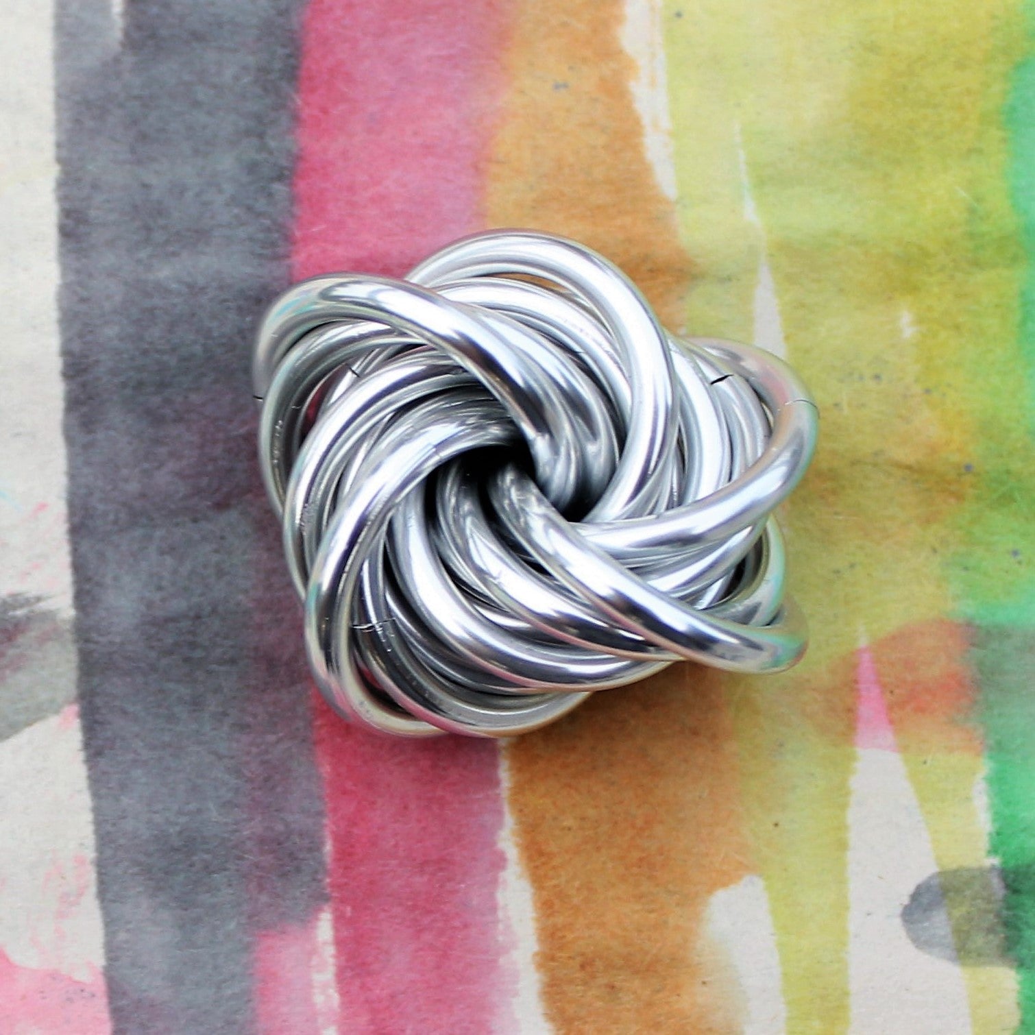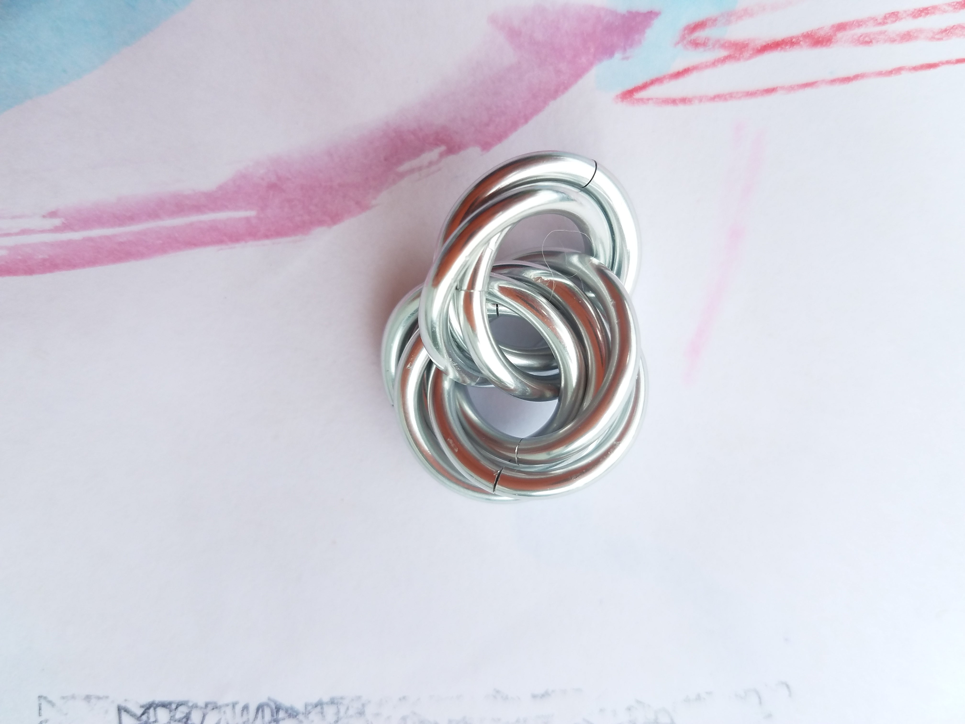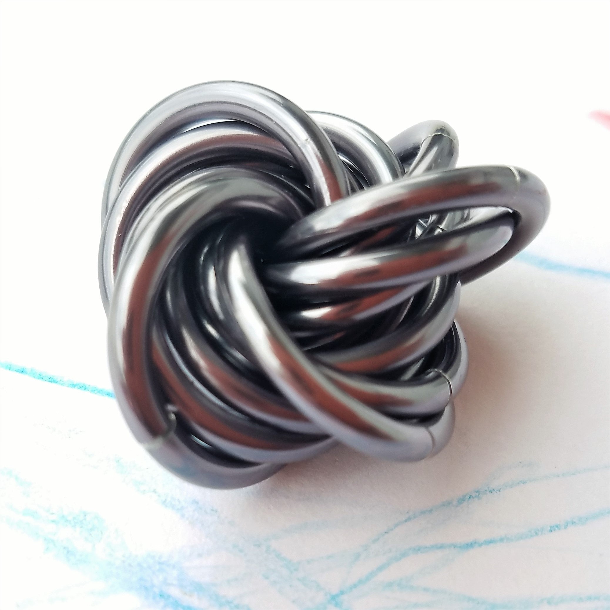 Rings are woven together so that you can rotate the rings through and spin this in your hand forever. The design cycles back in on itself so it goes on forever!
