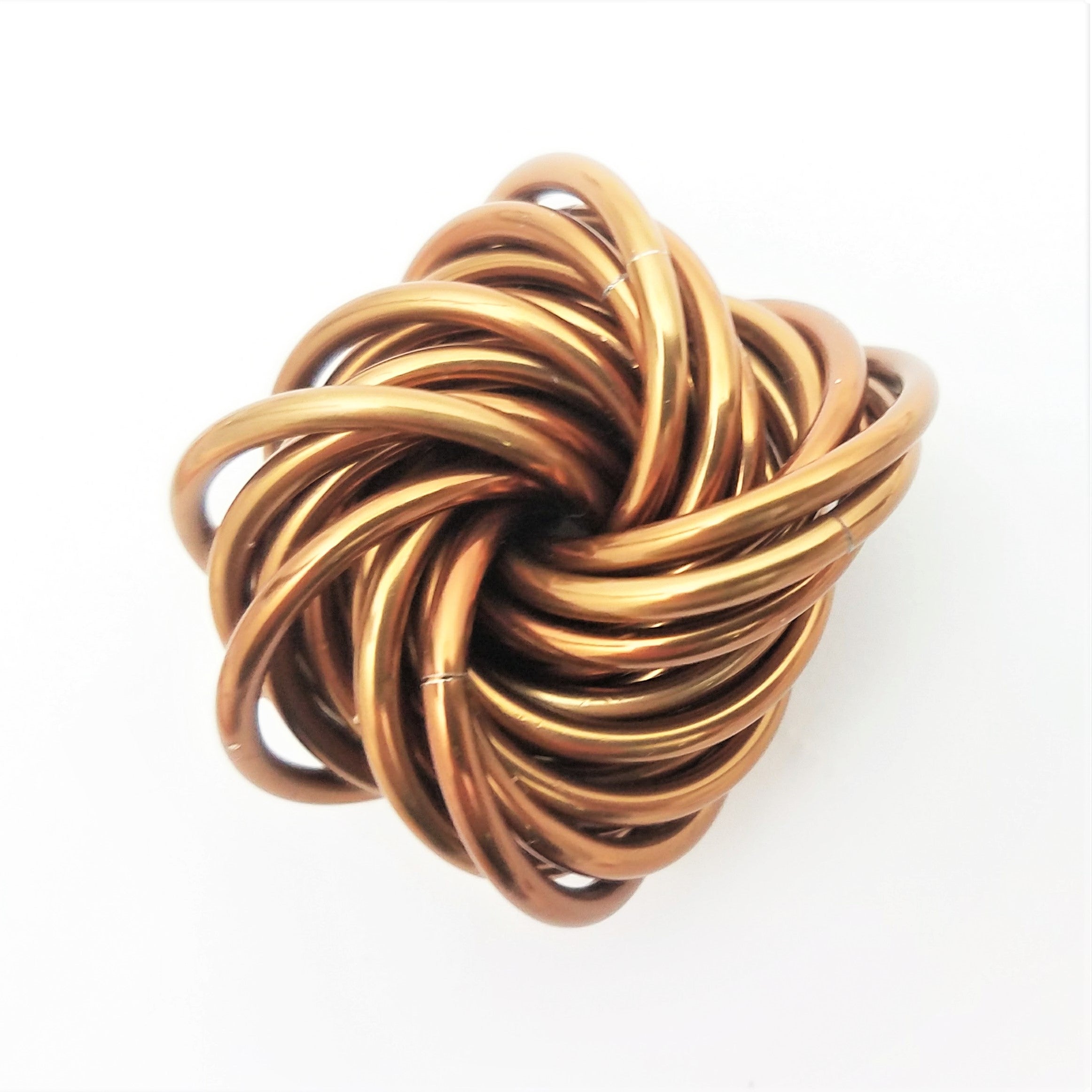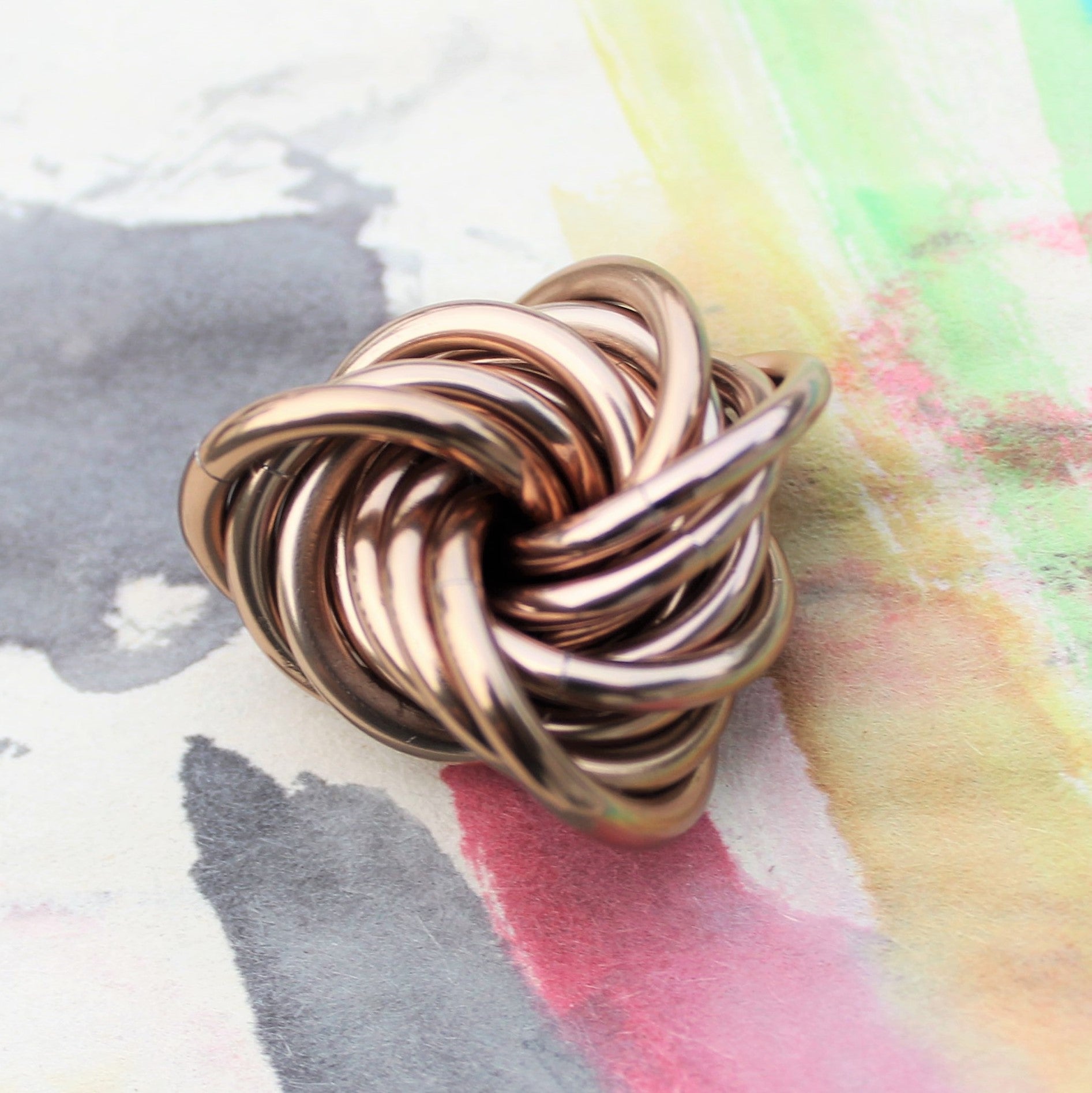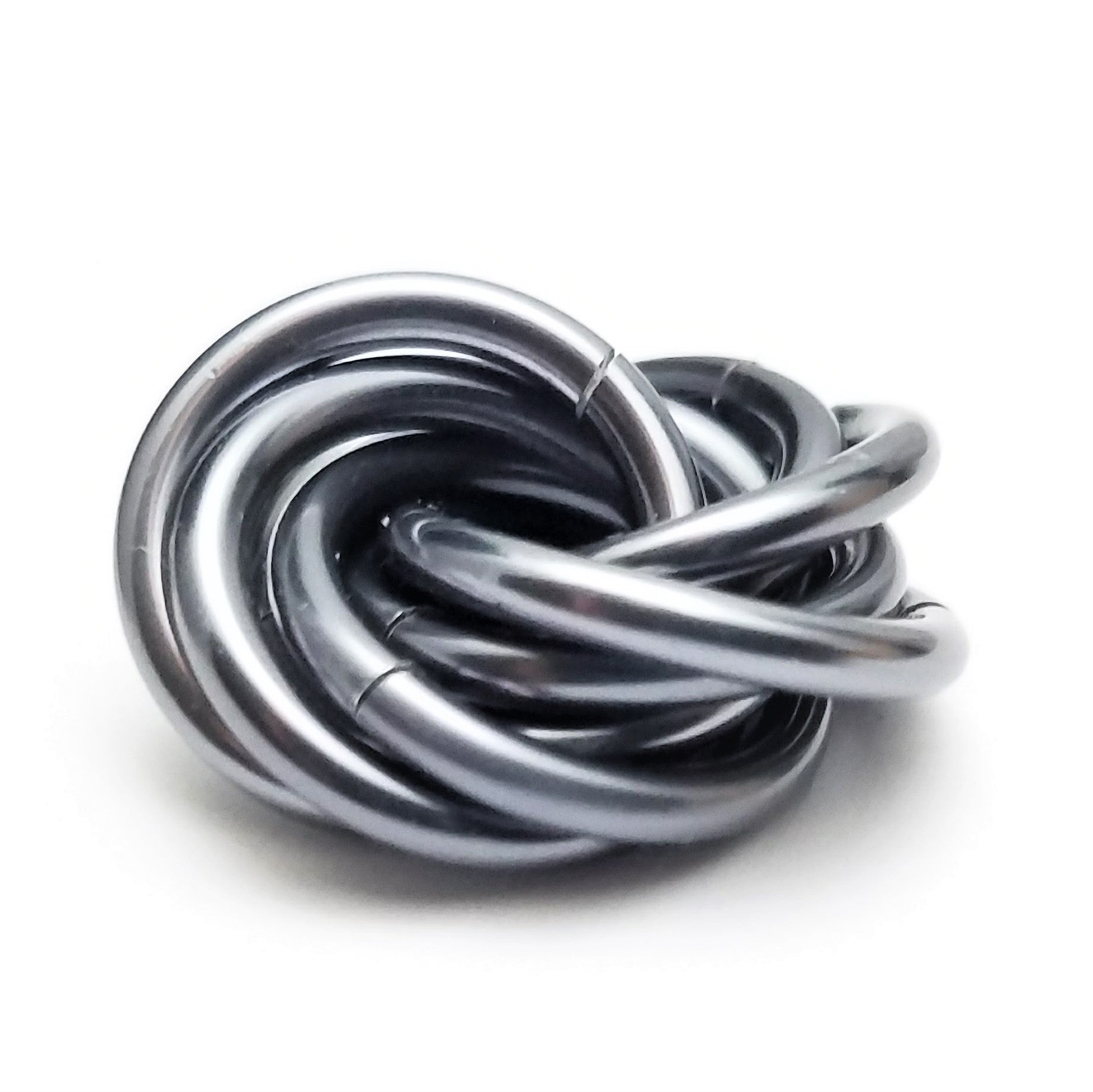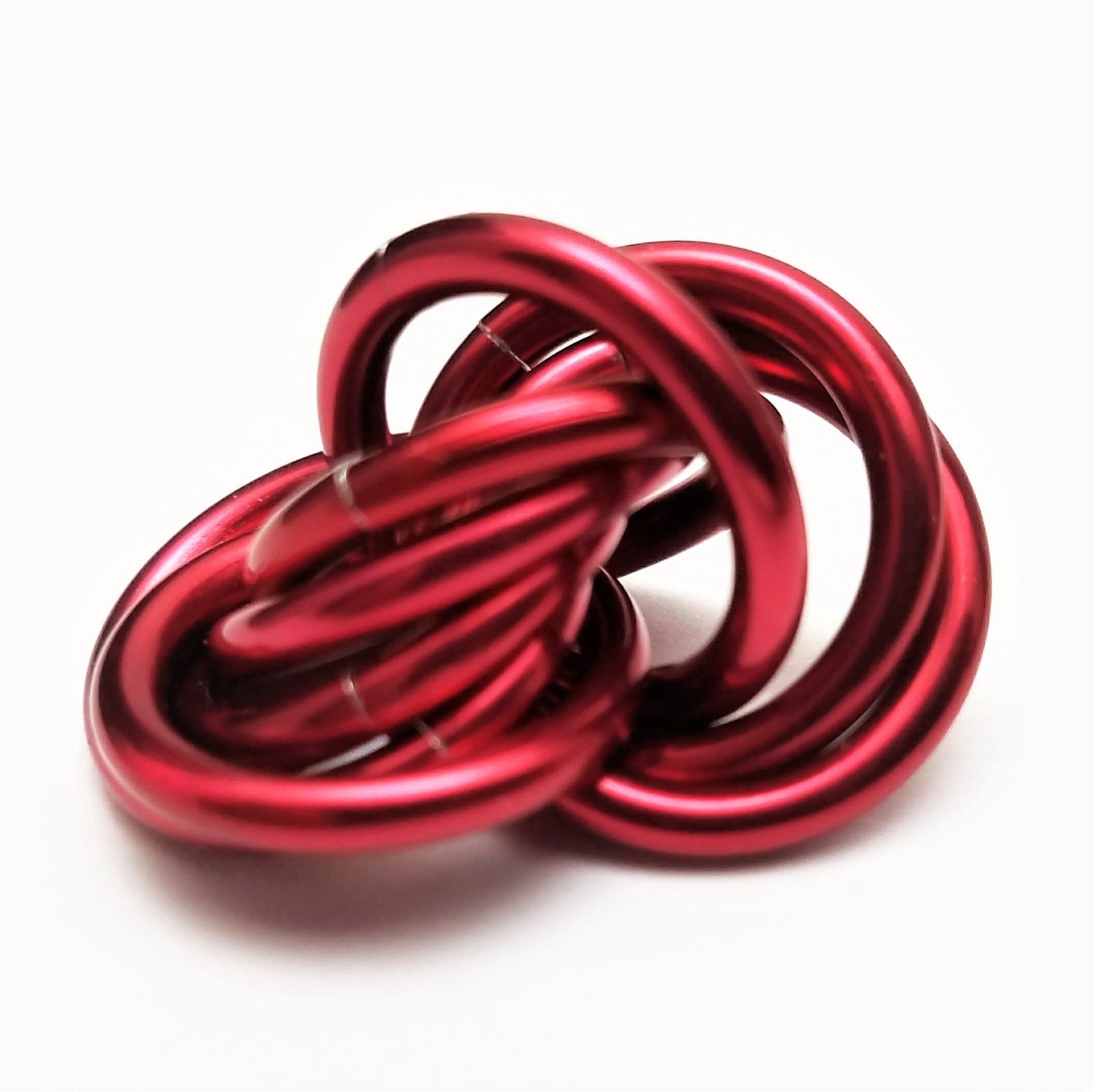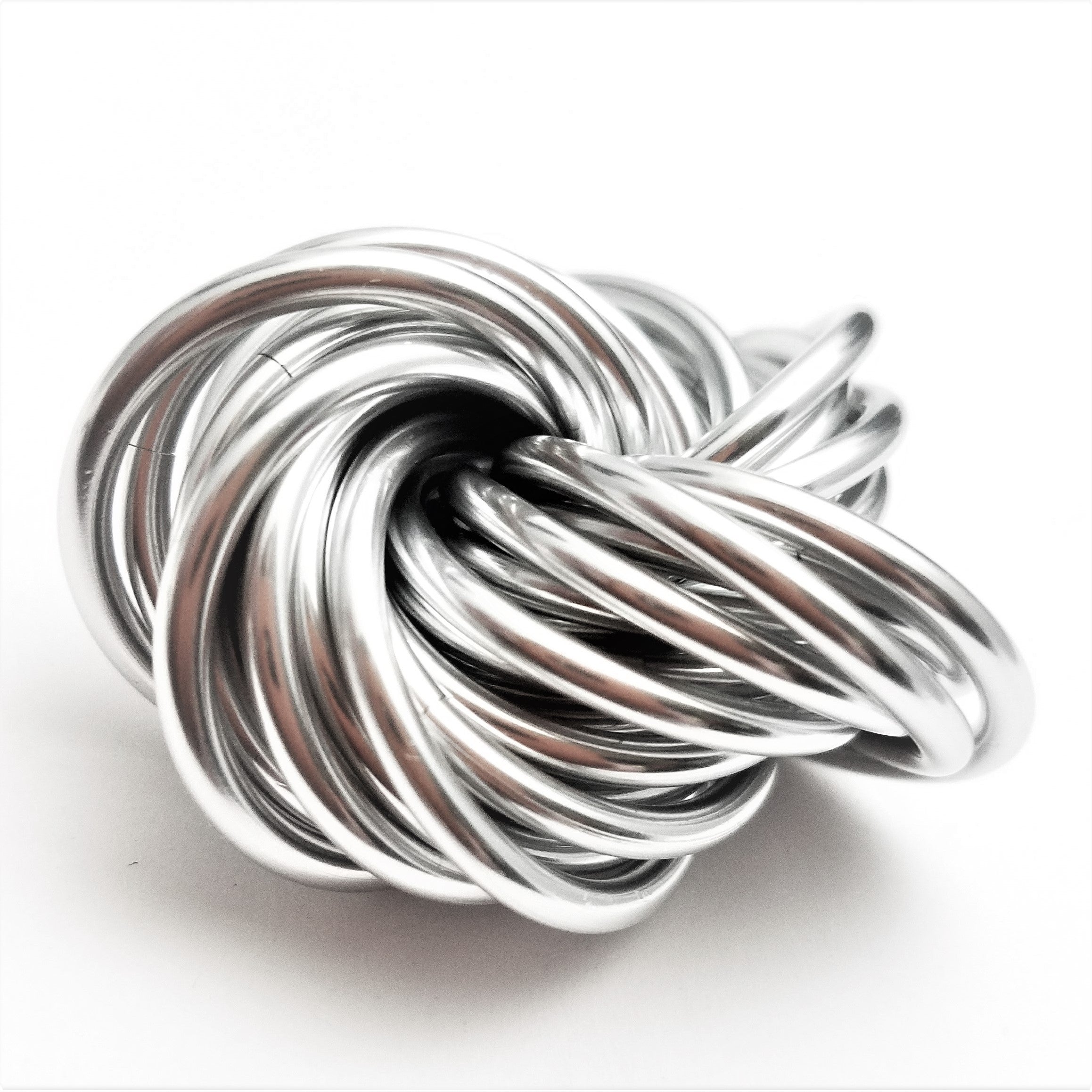 Rings are woven together so that you can rotate the rings through and spin this in your hand forever. The design cycles back in on itself so it goes on forever!