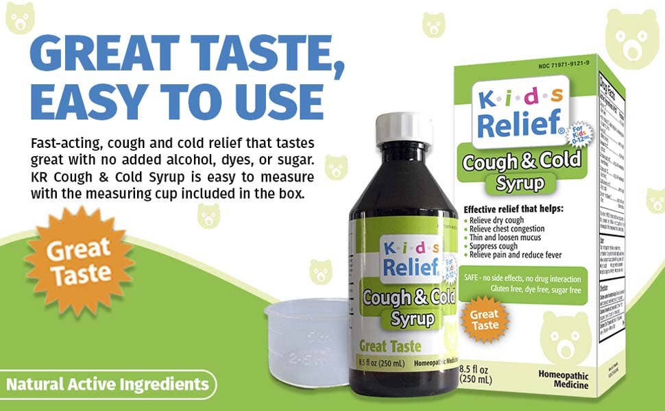 Mothers are constantly searching for safe and effective remedies to help ease their child's cold symptoms. The search is over with Kids Relief Cough and Cold Syrup that acts as an expectorant while soothing a dry, irritating cough. Kids Relief Cough & Cold is a great-tasting, easy-to-administer formula that safely helps eliminate your child’s cough and cold symptoms.