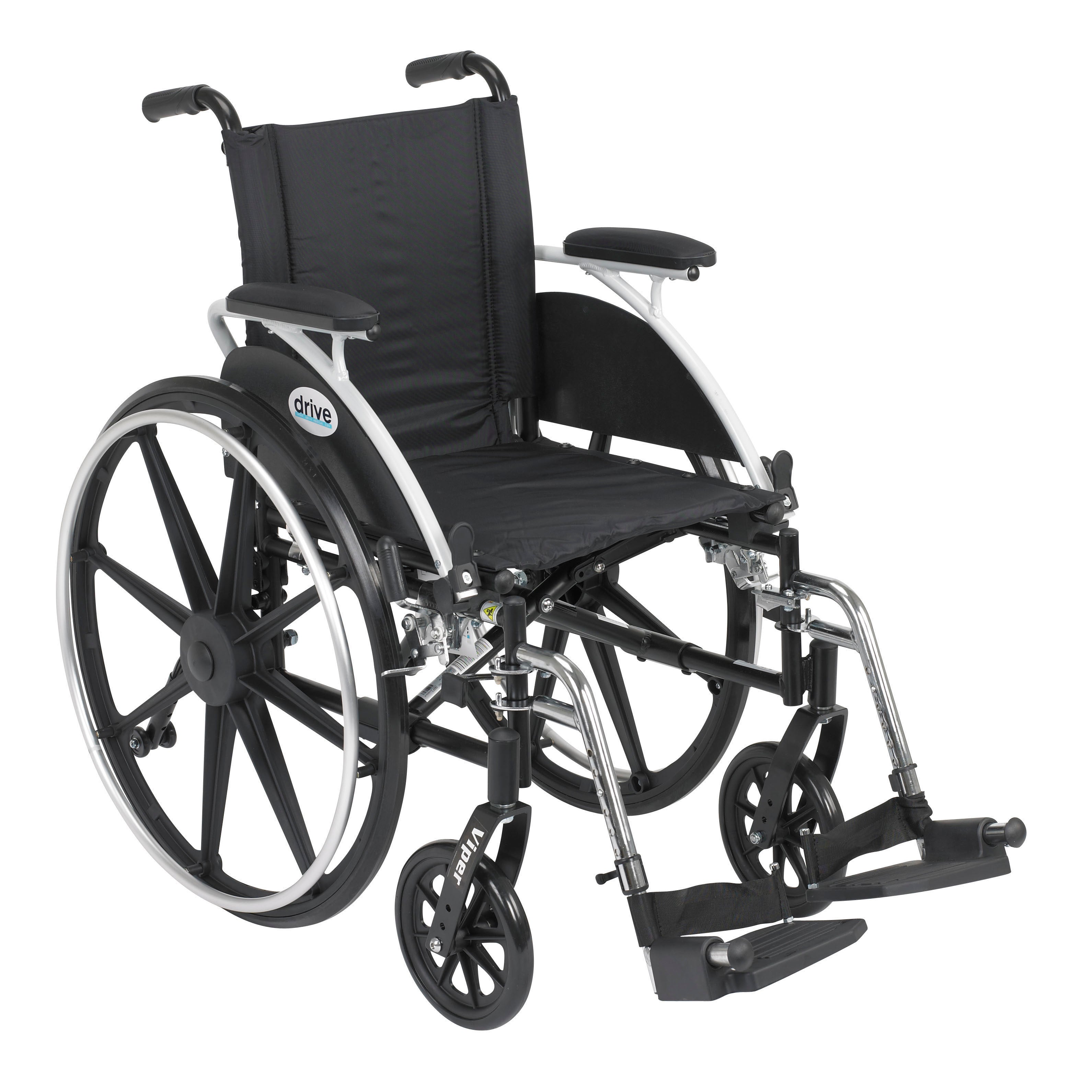 The Drive Medical Viper is a versatile wheelchair right out of the box and it is easier to propel and transport than an average weight wheelchair. The Viper comes standard with adjustable padded arms, multiple seat to floor height positions, anti-tippers with flip-up wheels which never have to be removed and push to lock wheel locks. The back is height adjustable to provide added patient comfort. The carbon steel frame is high strength while remaining lightweight. The wheelchair upholstery is made of durable nylon for long lasting comfort and cleanliness. These comfort options make the Viper from Drive Medical an ideal wheelchair for anybody that needs to be in a wheelchair for extended periods of time. This wheelchair comes with flip back removable desk arms, swing away footrests, and a 12" wide seat.