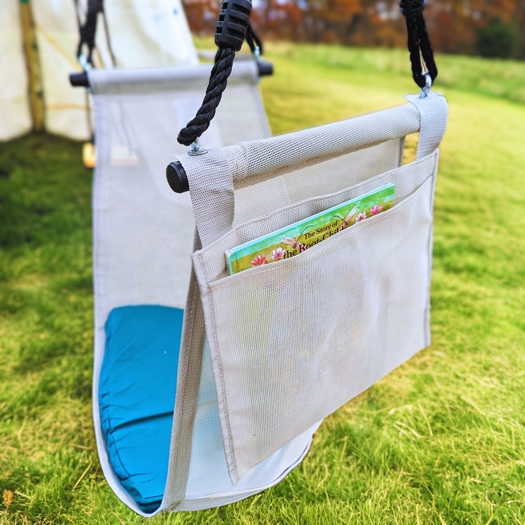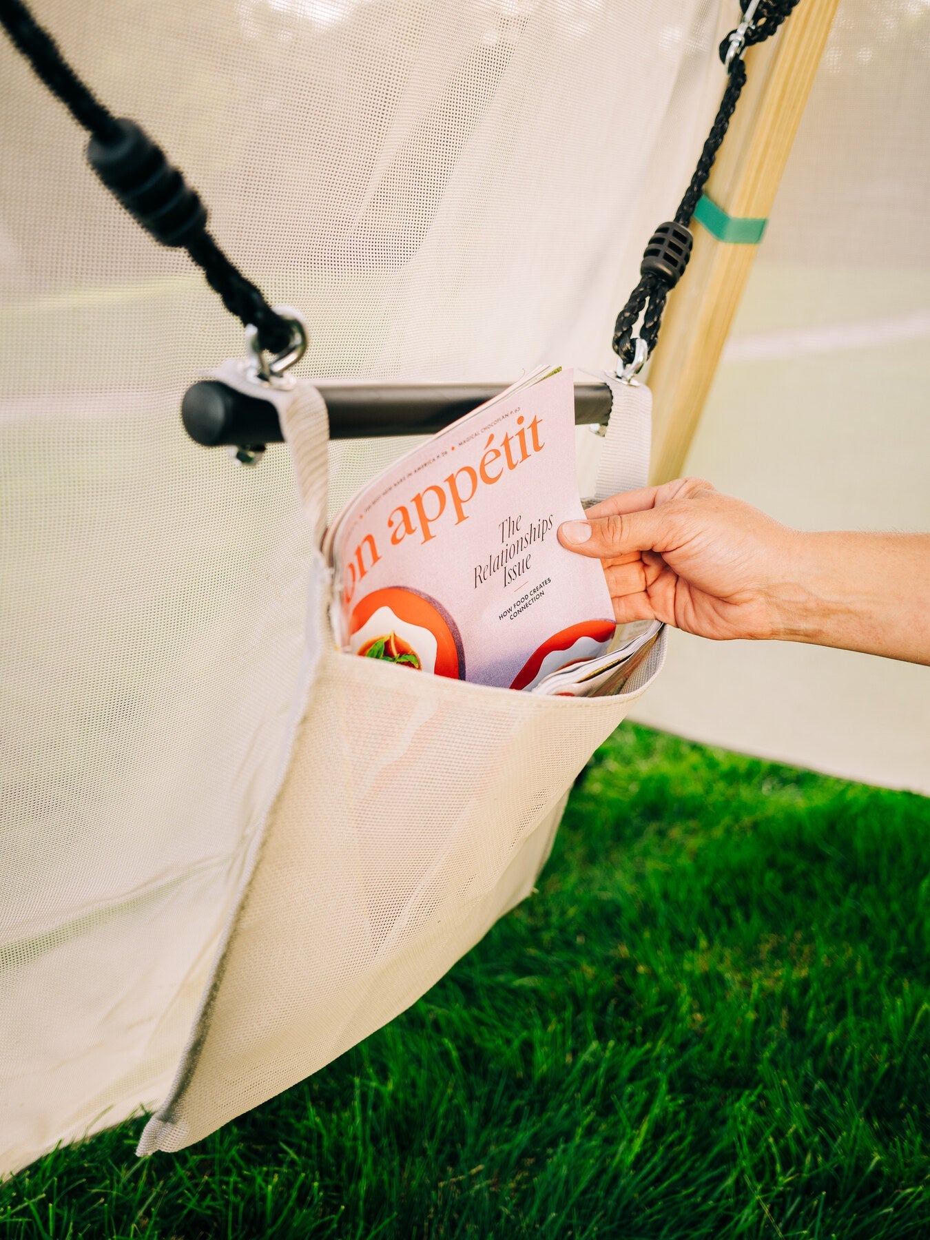 With a 10-pound capacity, this pocket is perfect for storing all your books, magazines, drinks, and games. Boasting a UV-resistant teslin pocket with reinforced grommets and a powder-coated steel hanging bar, you can easily attach it between any two points in your Bijou Mainstay.