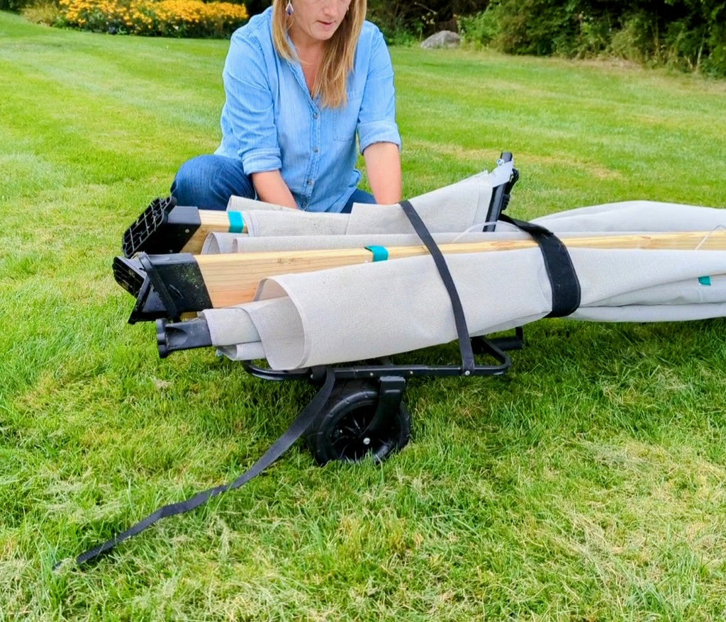 No tools required - simply snap together for assembly. With large rubberized wheels, rough terrain is no match for your Bijou on the go. Use the included cam straps and velcro handles from your Mainstay or Haven to secure and roll away with ease.