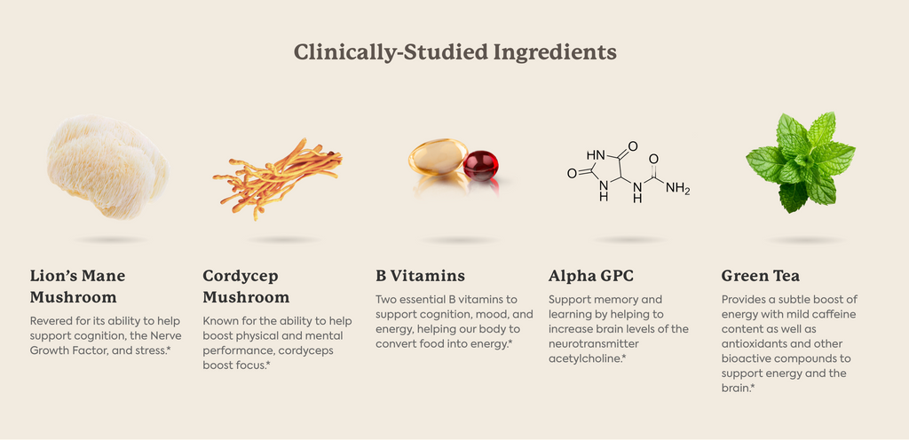Lion’s Mane, an adaptogen that supports the stress response of cortisol while the B vitamins play a role in producing brain chemicals that affect mood and other brain functions. Low levels of B-12 and other B vitamins, such as vitamin B-6 and folate, may be linked to depression.