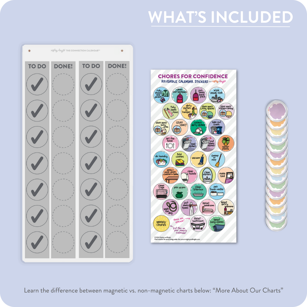 One Reusable sticker sheet with 37 stickers: "Daily Tasks" and "Weekly Tasks" titles to label your task chart, Weekly Chores (for your weekly calendar, so your kids know what day their weekly tasks should be done), Tidy shoes and jackets, Clean out backpack, Put away backpack, Wipe inside sink, Tidy bath items, Dirty clothes in hamper, Stuff Hunt - living spaces, Stuff Hunt - kitchen + dining, Stuff Hunt - entry area, Stuff Hunt! (general), Collect dirty dishes, Take out Trash, Set the Table, Load Dishes, Put Away Dishes, Water Plants, Do Laundry, Fold Clothes, Vacuum, Sweep or Mop, Spray + wipe down counters and table, Clean Toilets, Clean Mirrors, Make Bed, Clean pet cage, Pick up poo, Clean litterbox, Pet food + water, Walk the Dog, Put Away Towel, Reset Bedroom, Reset Entry, Reset Bathroom, Reset Living Spaces