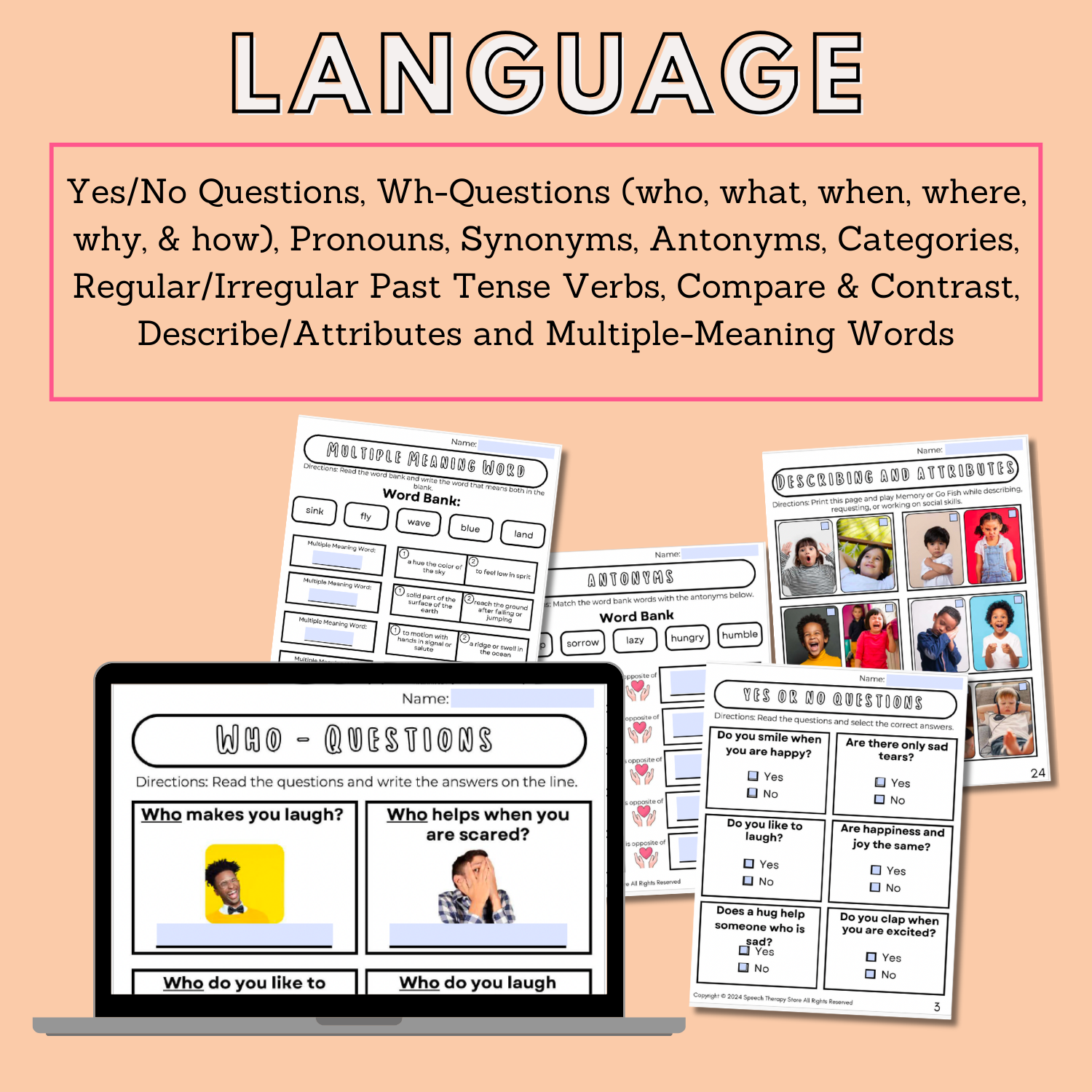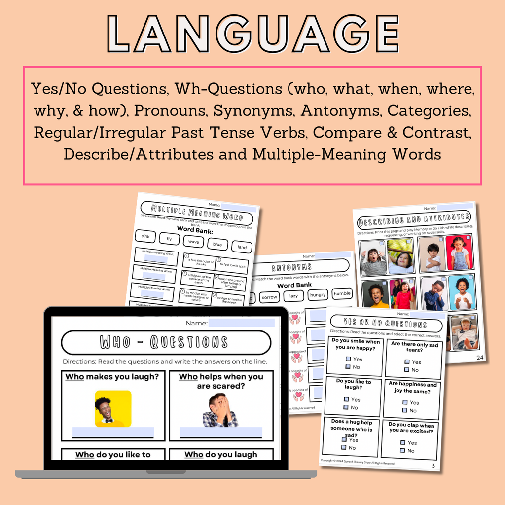 2. Language: Yes/No Questions, WH-Questions (who, what, when, where, why, & how), pronouns, synonyms, antonyms, categories, regular/irregular past tense verbs, compare & contrast, describe/attributes, and multiple-meaning words.