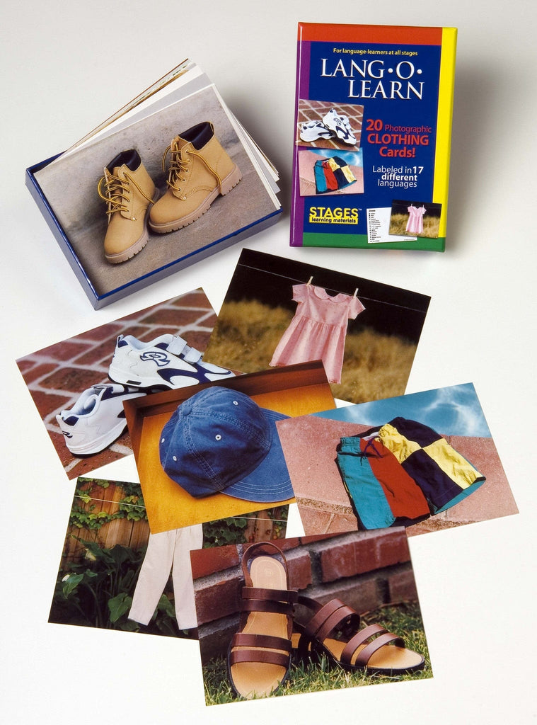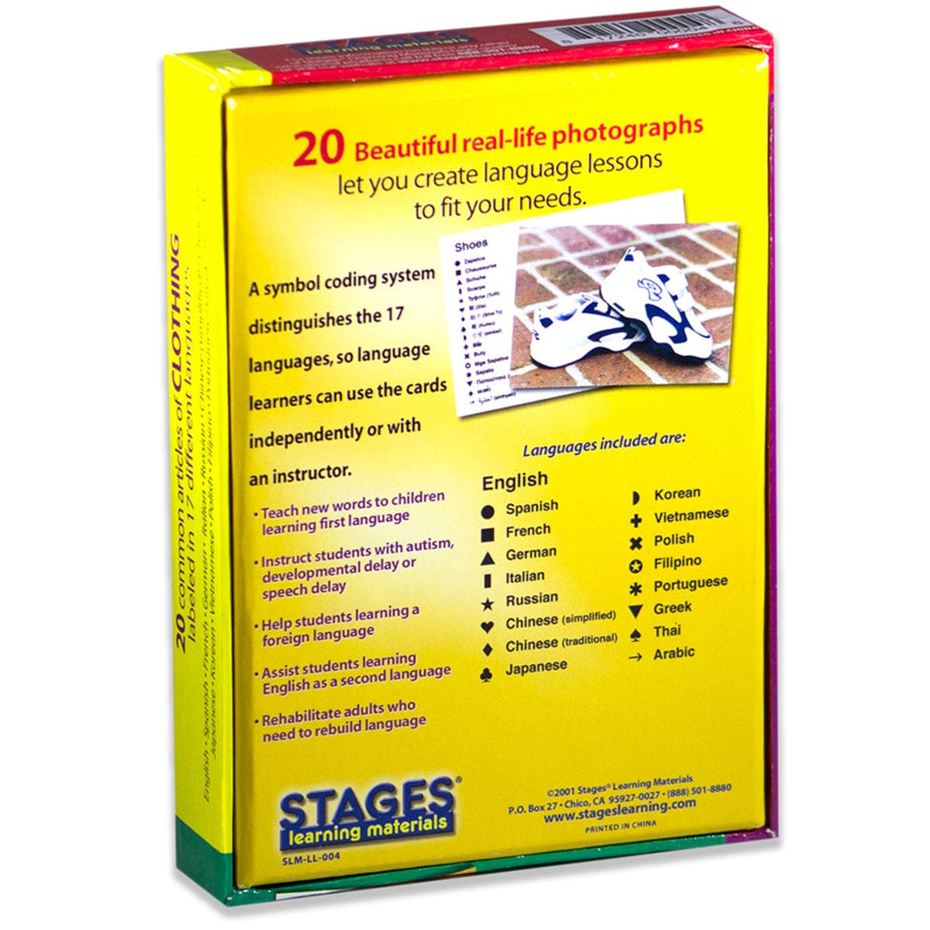 The Real Photo Clothing Card set features 20 bright, colorful, and current photographic images for teaching basic language skills. Each card is labeled on the reverse in 17 common languages: