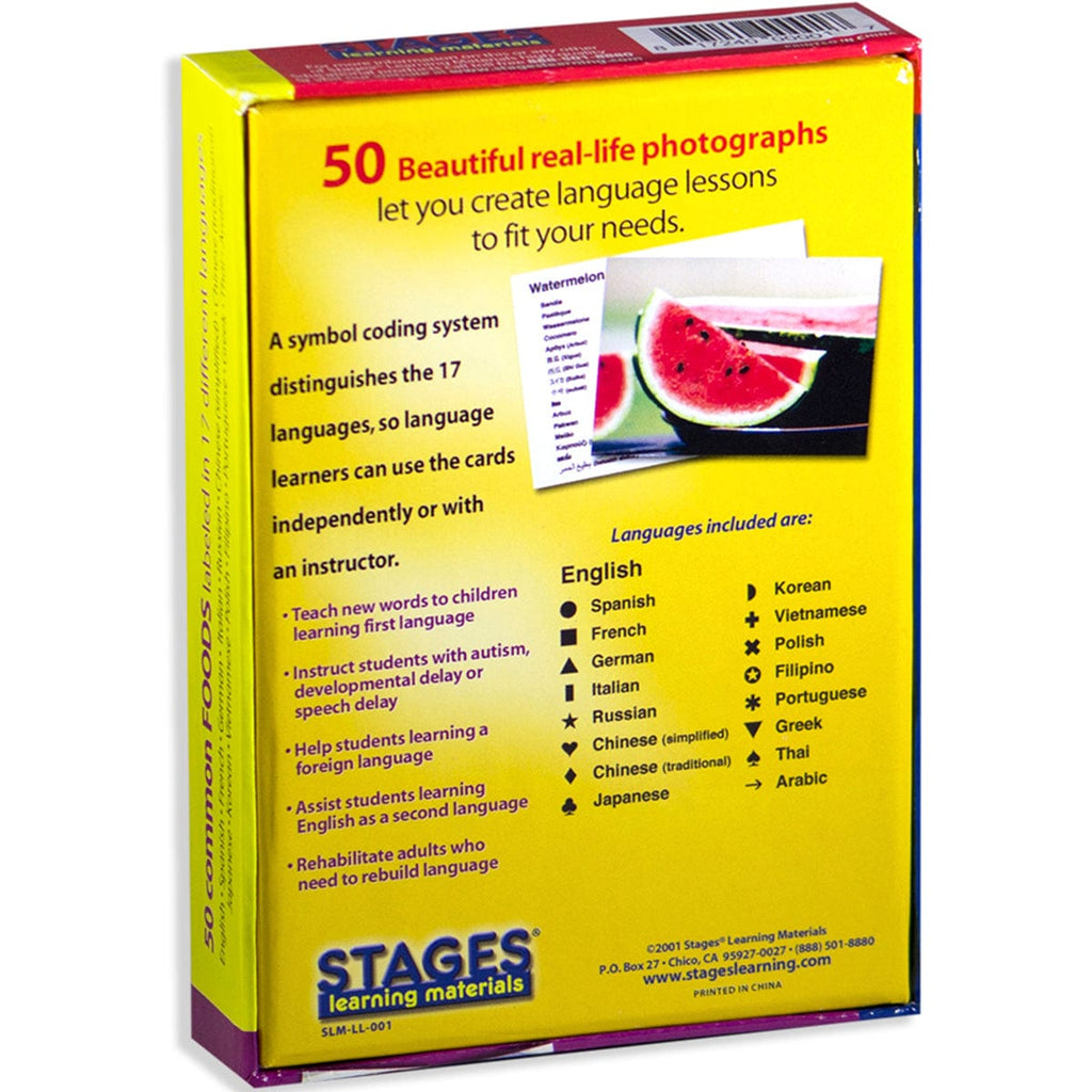 The 50 Real Photo Food Card set features bright, colorful, and current photographic images for teaching basic language skills. Each card is labeled on the reverse in 17 common languages: