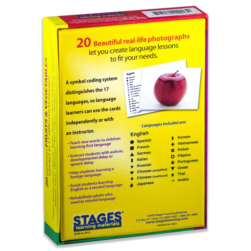 The Real Photo Fruits & Vegetables Card set features 20 bright, colorful, and current photographic images for teaching basic language skills. Each card is labeled on the reverse in 17 common languages: