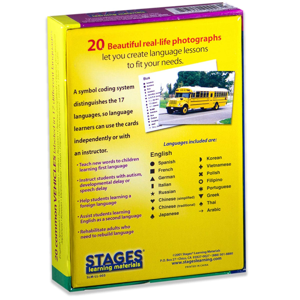 The Real Photo Vehicle Card set features 20 bright, colorful, and current photographic images for teaching basic language skills. Each card is labeled on the reverse in 17 common languages: