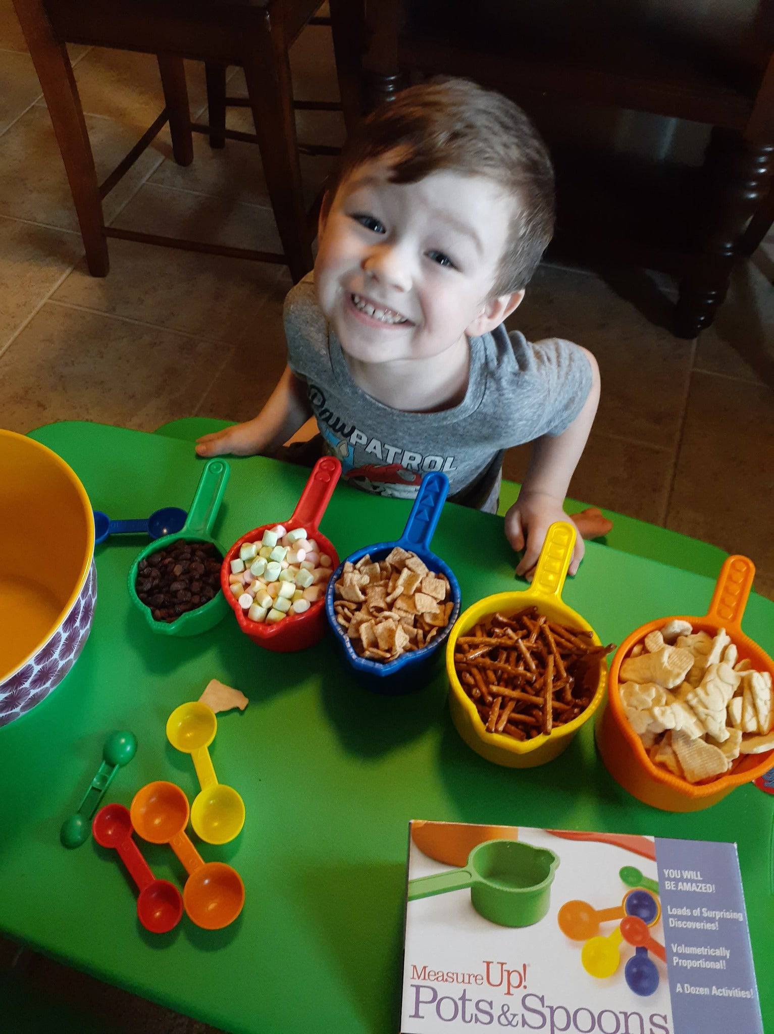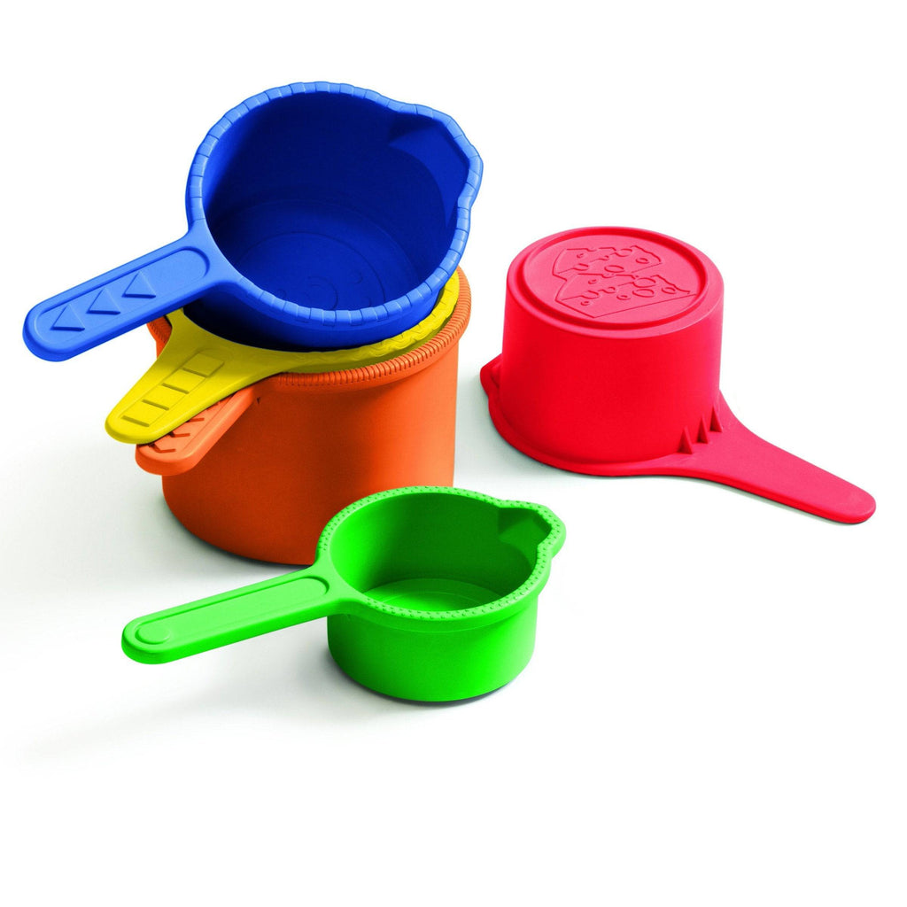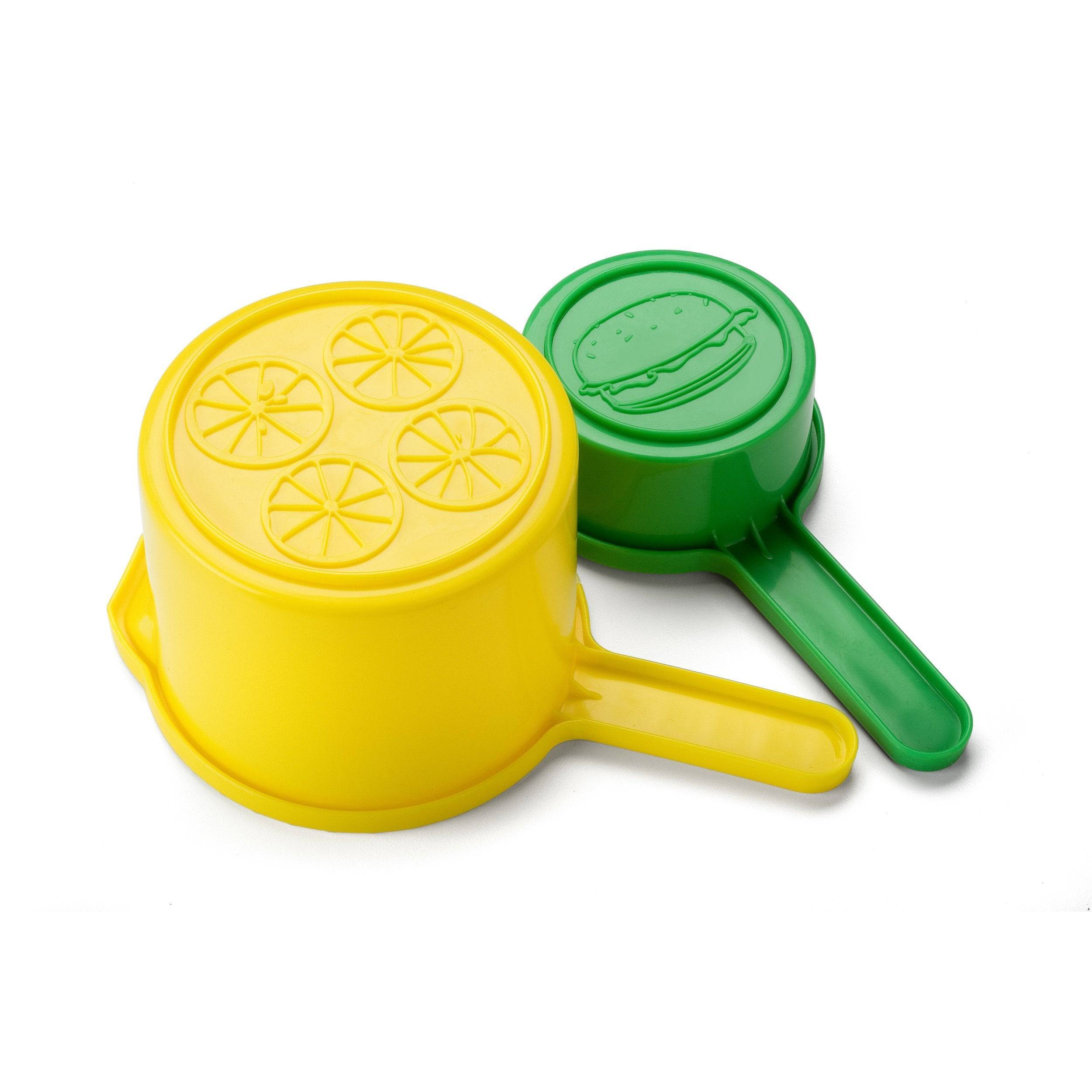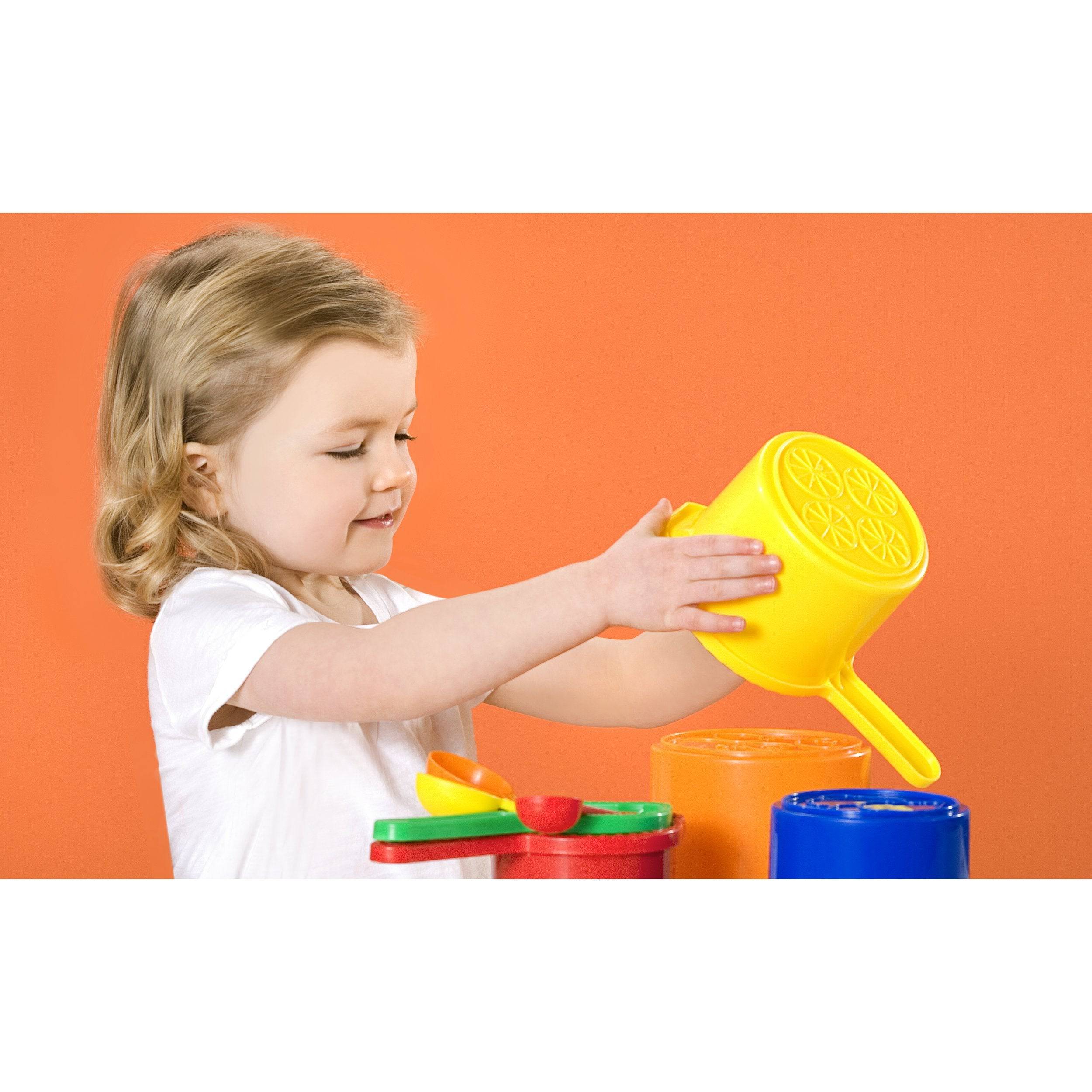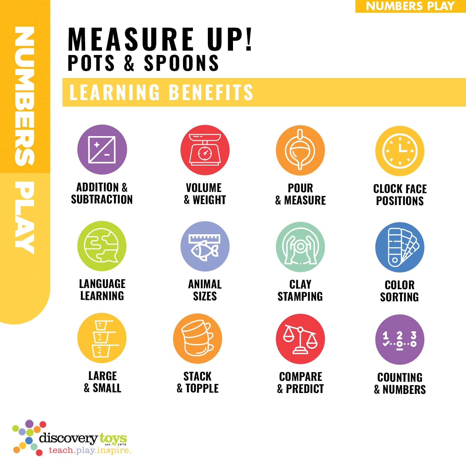Watch learning in action with this kitchen-themed set. Use to scoop, dump, fill, nest, stack, mold and stamp. Spoons and and pots are all volumetrically correct & sequentially sized for interaction. Volumes can be added or subtracted. Introduce a host of fundamental concepts related to counting, sorting, volume, size, patterns, measurement, clock time & more. 5 progressive pots, 5 two-sided spoons, guide with 12+ activities. Designed to interact with Measure Up!® Cups.