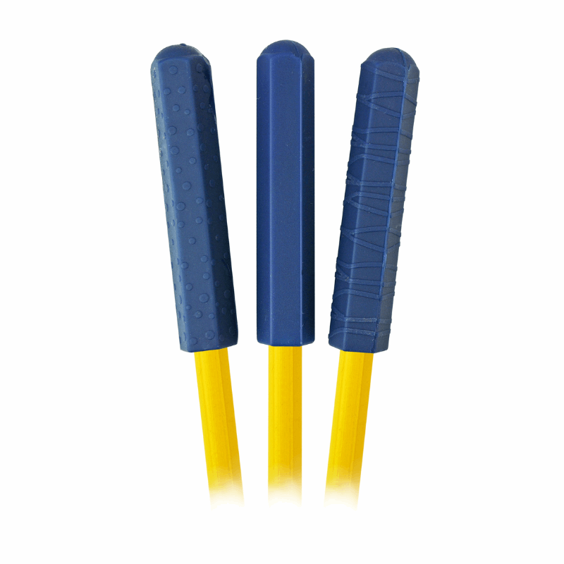 Set of three chewable pencil toppers. Features one each of three unique textures: dotted, smooth, and ridged. Fits most average-sized pens and pencils. Pencils not included.