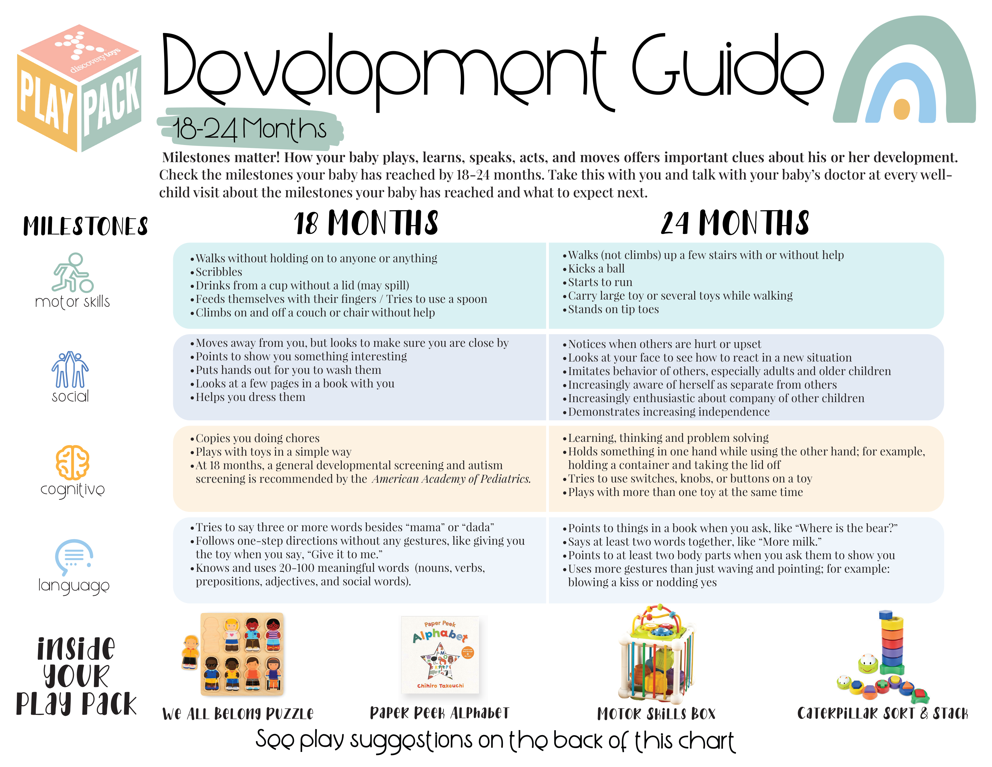 Milestones matter! How your toddler plays, learns, speaks, acts, and moves offers important clues about his or her development. Check the motor skills, social, cognitive, and language milestones your little one has reached by 18-24 months with the aid of this play pack. In this pack we have included our best products for 18-24 months (one of which is only available with this play pack) along with a 2-page Development Guide which can help you know what skills your child is likely to develop at this age.