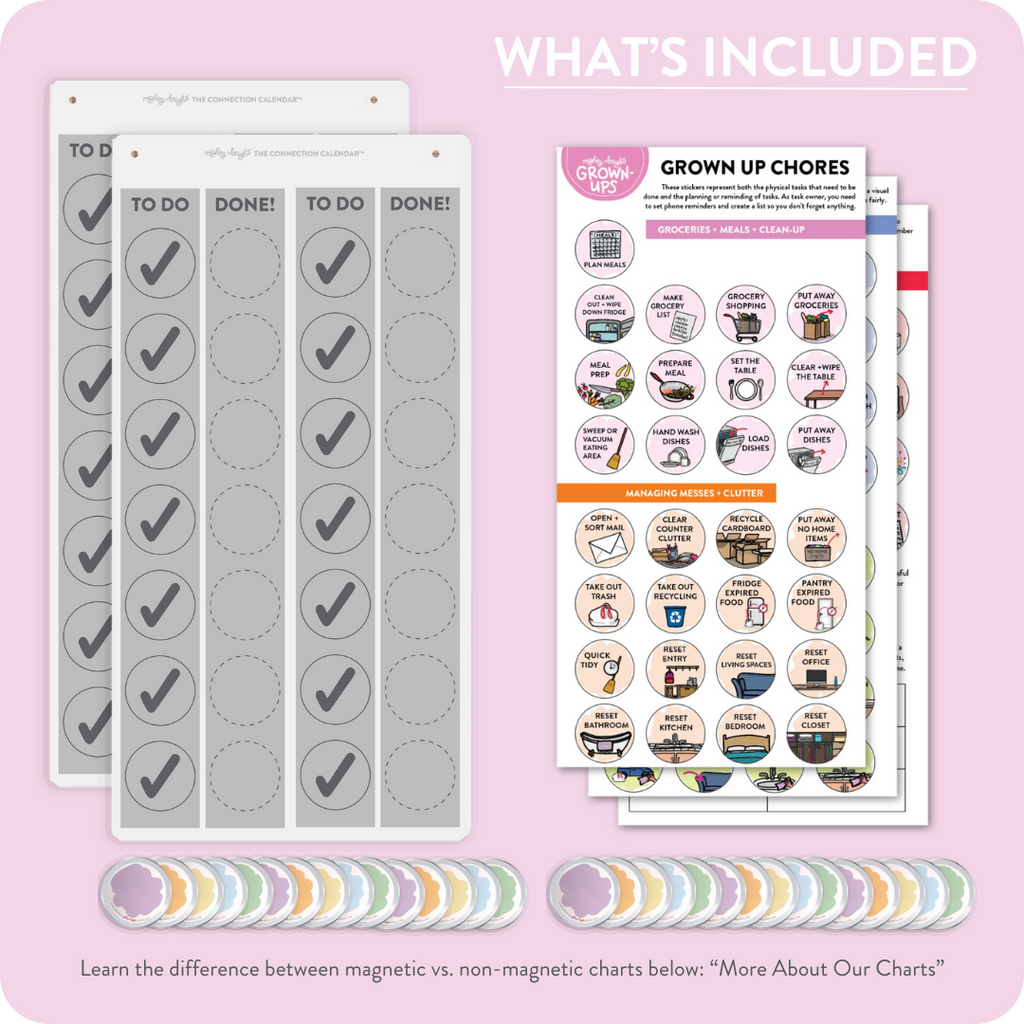 • Set of three "Division of Labor and Chores" reusable sticker sheets, which includes 83 total stickers, split up into color-coded categories: