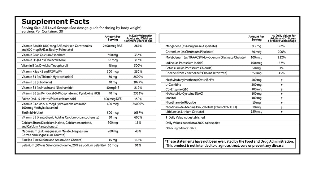 Many vitamins and minerals at doses determined to be optimal based on research studies, in highly-bioavailable forms for optimal absorption