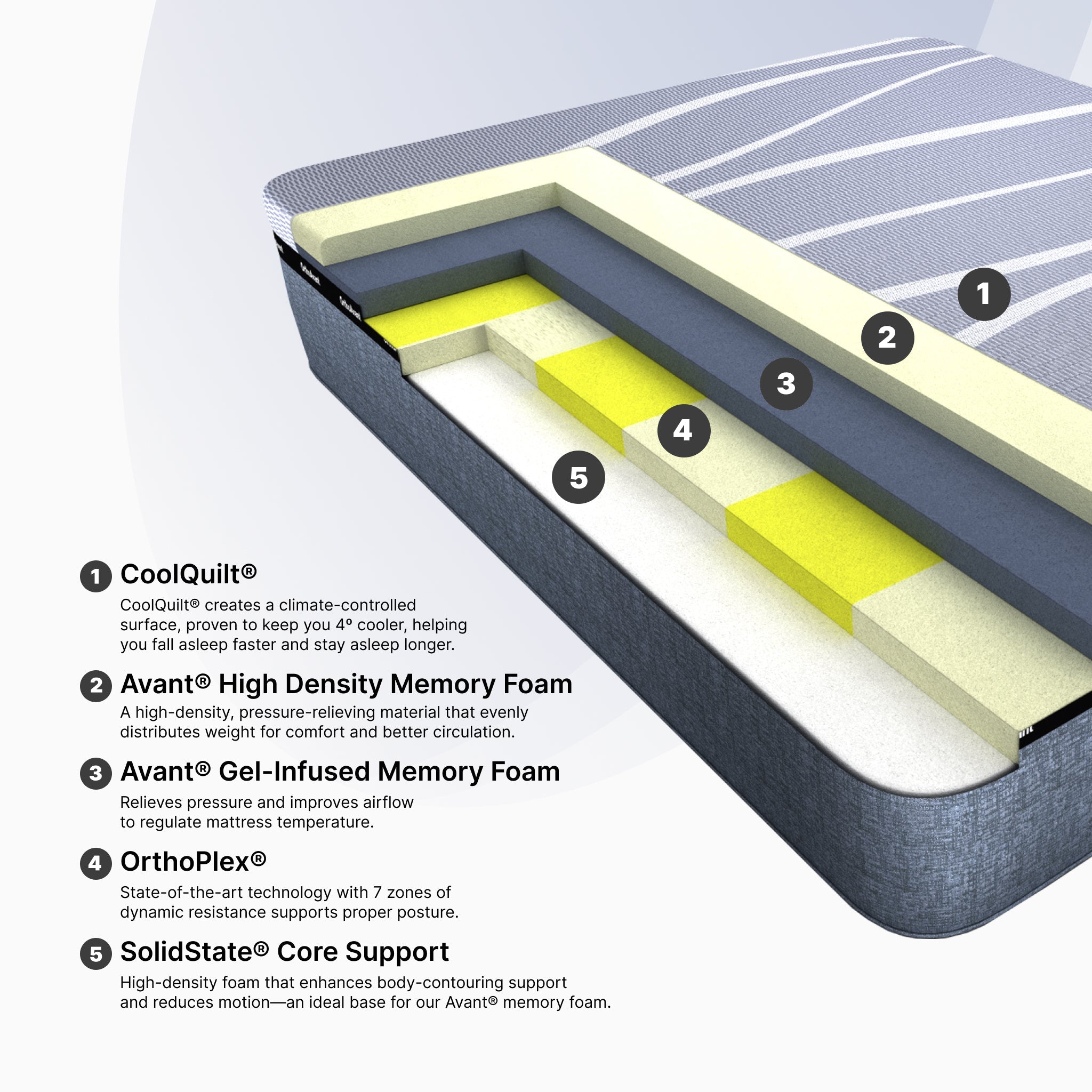 Introducing the Avant® Luxe Astro, where industry-leading cutting-edge technology intersects with refined comfort. With the OrthoPlex® 7 zone support system, numerous cooling layers and high-density Avant® visco memory foam; the Avant® Luxe Astro is the best way to upgrade your sleep.