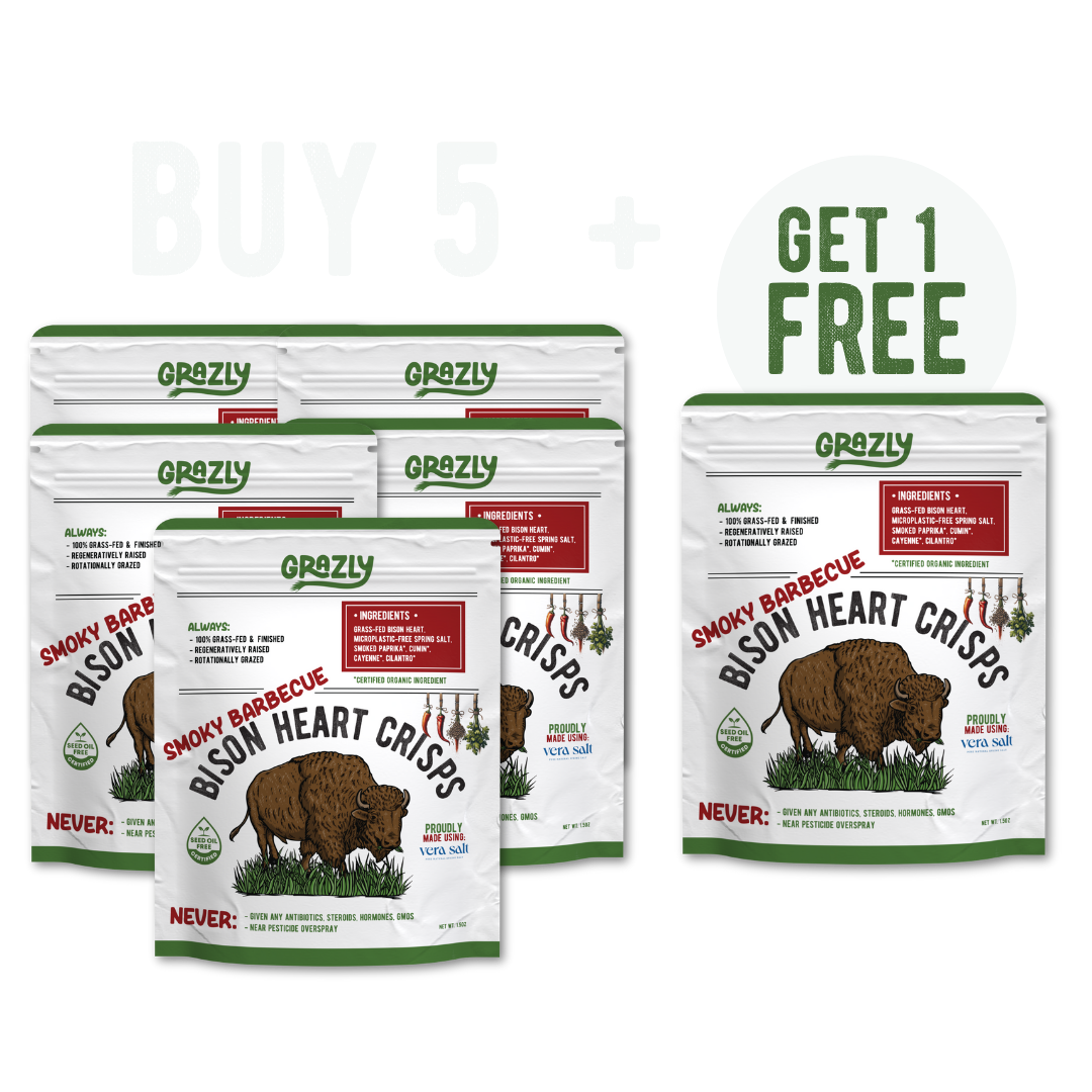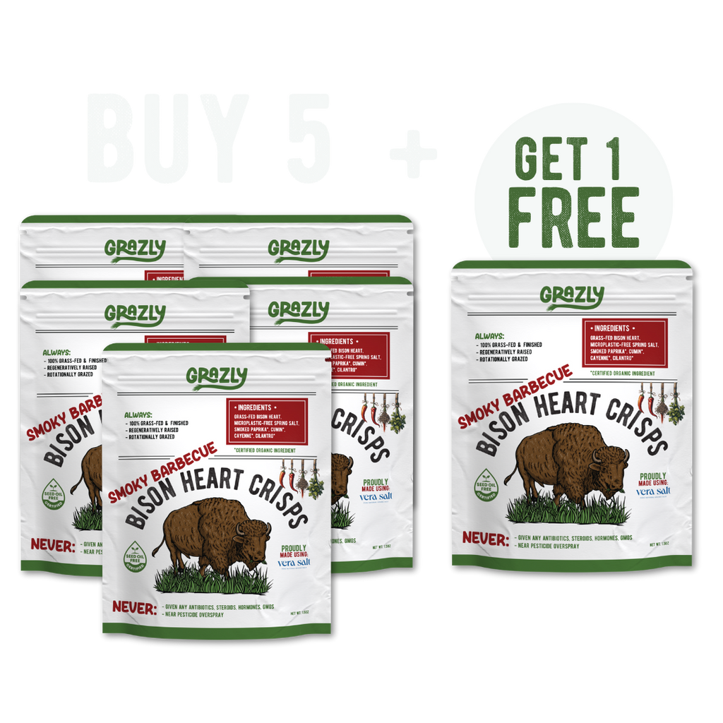 Our bison is 100% grass-fed, 100% grass-finished, regeneratively & humanely raised, never given any antibiotics, hormones, or GMO's, and never near pesticide overspray.