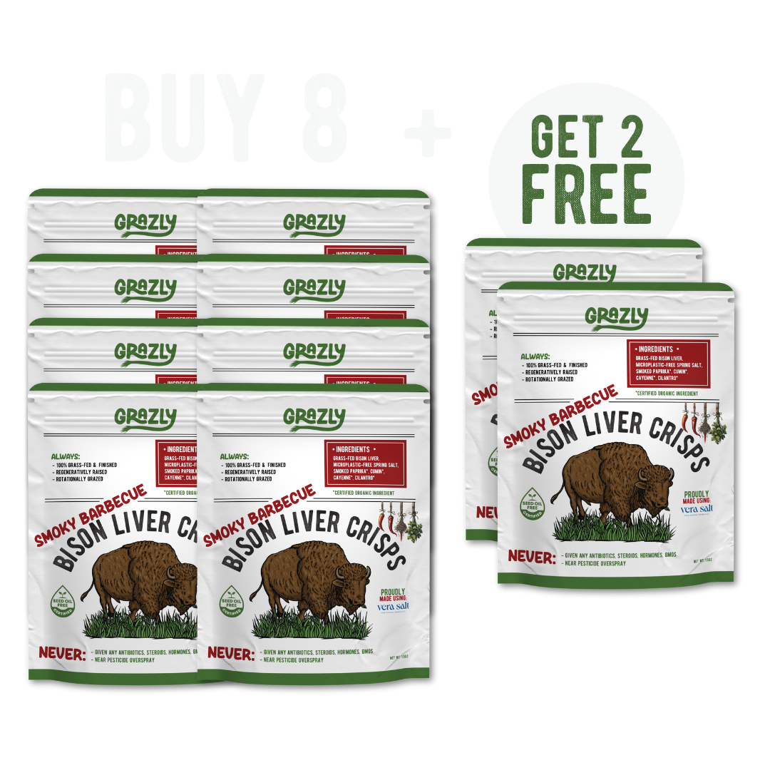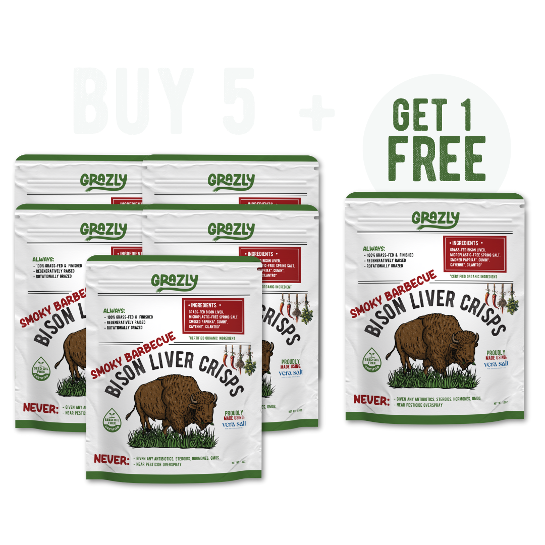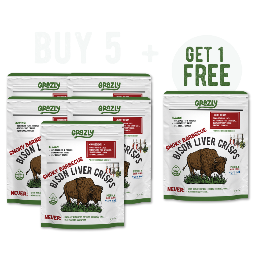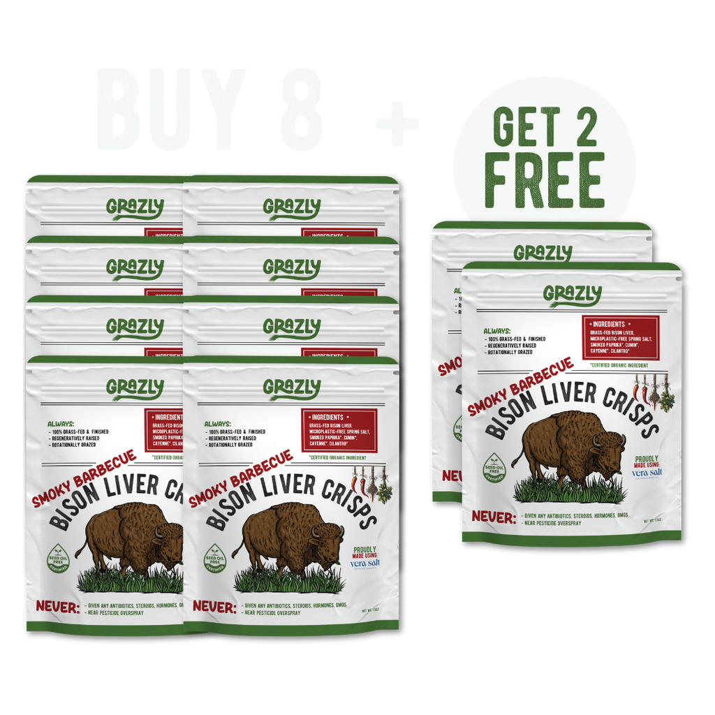 Our bison is 100% grass-fed, 100% grass-finished, regeneratively & humanely raised, never given any antibiotics, hormones, or GMO's, and never near pesticide overspray.