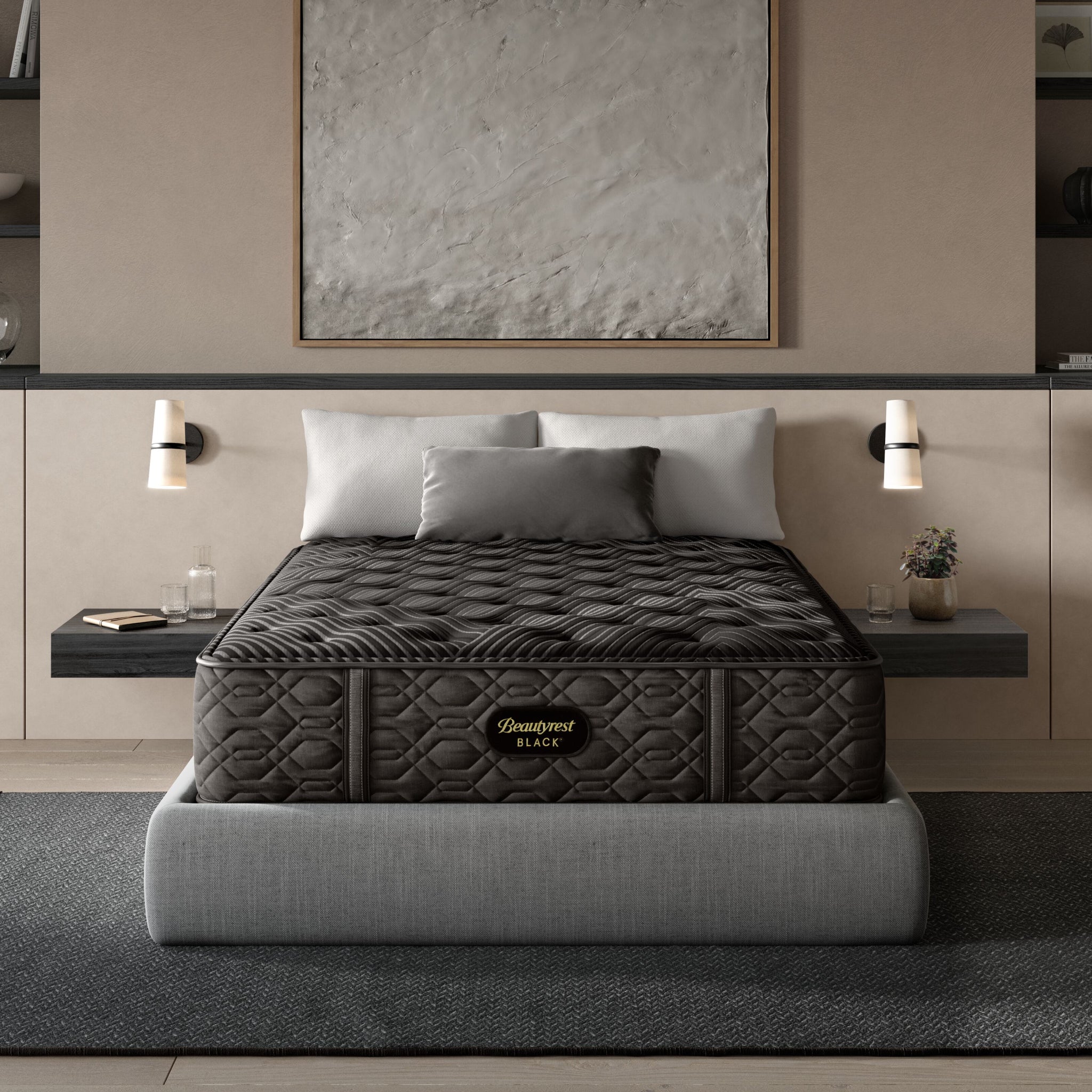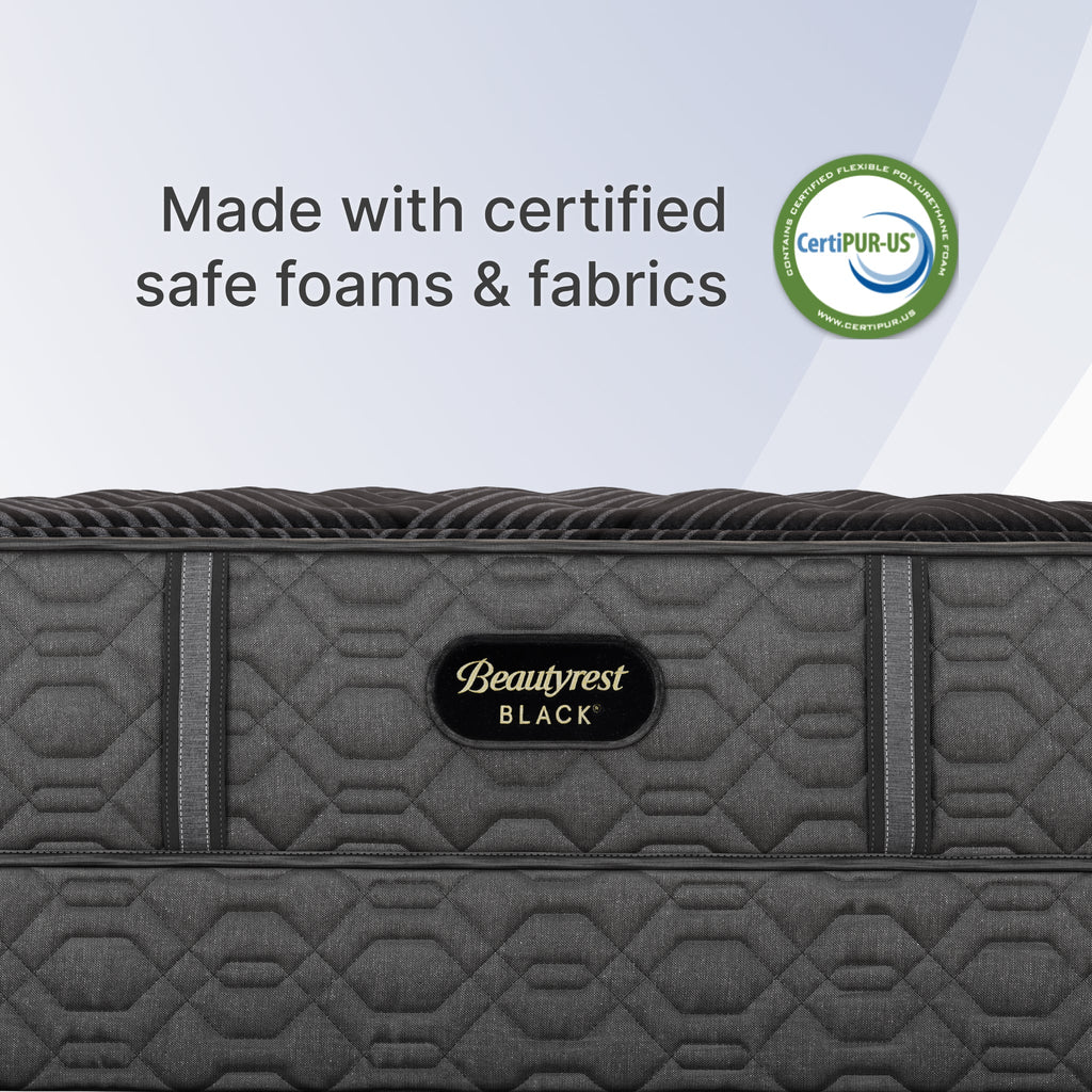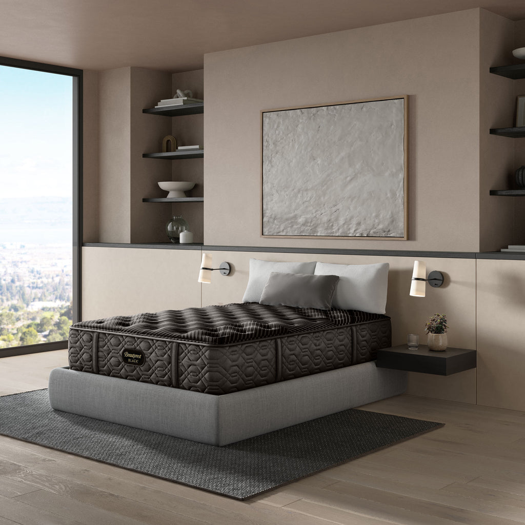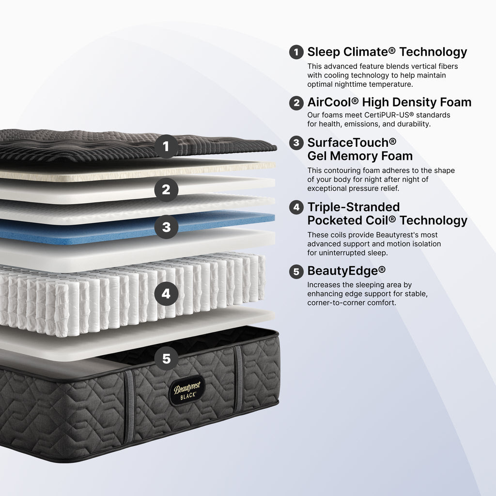 Discover where luxury meets innovation with Beautyrest Black®. Designed with Triple-Stranded Pocketed Coil® Technology, this mattress offers advanced, individualized support and motion separation, Sleep Climate™ Technology for all-night heat transfer, and Beautyrest® Gel Memory Foam for contouring pressure relief. Experience our most advanced sleep system with Beautyrest Black®, so you can rest luxuriously.