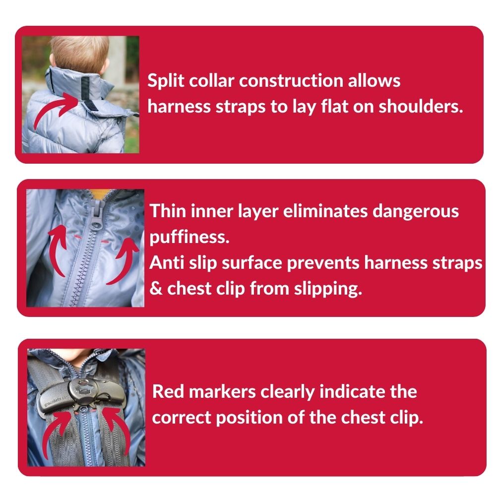 - Patented dual-zipper design prevents harness slack, keeping kids secure