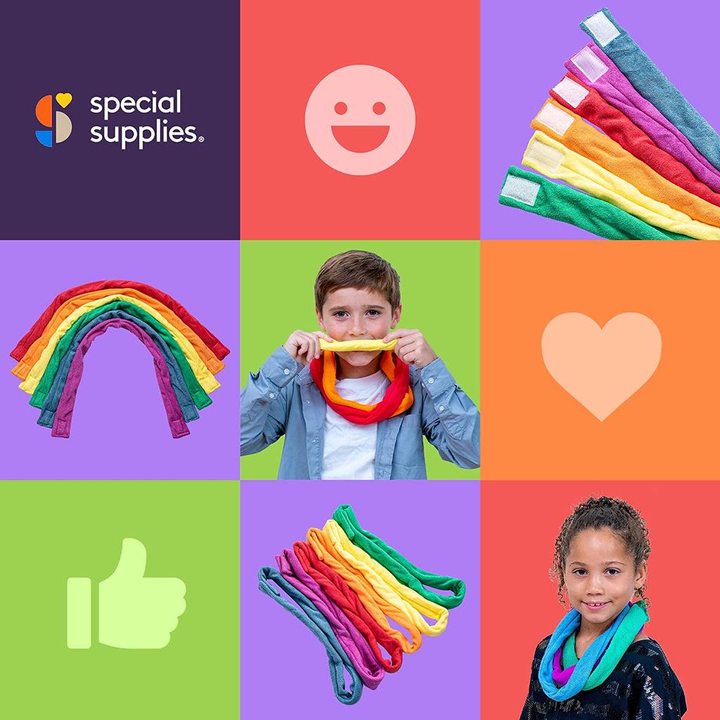 Chew Bands are super absorbent necklaces designed for children who need to chew or bite for calm and focus. Unlike plastic chew necklaces, these terry cloth bite bands soak up drool, keeping shirts dry even after extended periods of chewing. Bite Bands also exercise oral motor and facial muscles to prepare kids for good eating habits. Includes 6 bands. Non-returnable. Use with adult supervision.