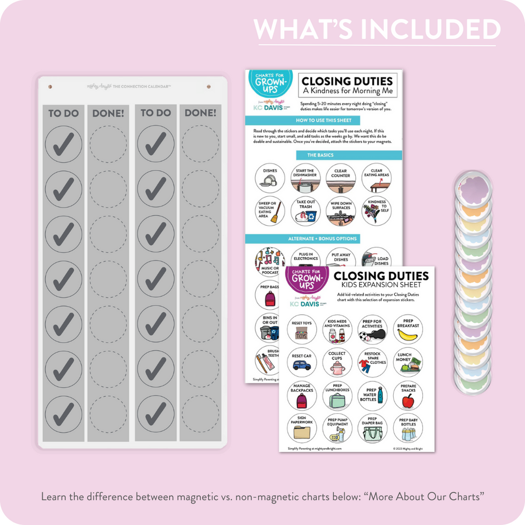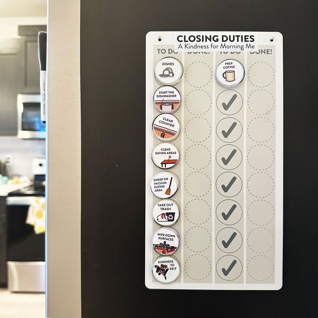 Closing Duties reusable sticker sheet includes 24 stickers and easy-to-follow directions. Stickers include: Dishes, Start the Dishwasher, Clear Counter, Clear Eating Areas, Sweep or Vacuum Eating Area, Take out the Trash, Wipe Down Surfaces, Kindness to Self, Music or Podcast, Plug in Electronics, Put Away Dishes, Load Dishes, Prep Bags, Prep Coffee, Track Spending, Take Meds, Bins in or Out, Reset Entry, Reset Living Spaces, Reset Office, Brush Teeth, Pet Duties, Lock Doors, Turn off Lights.