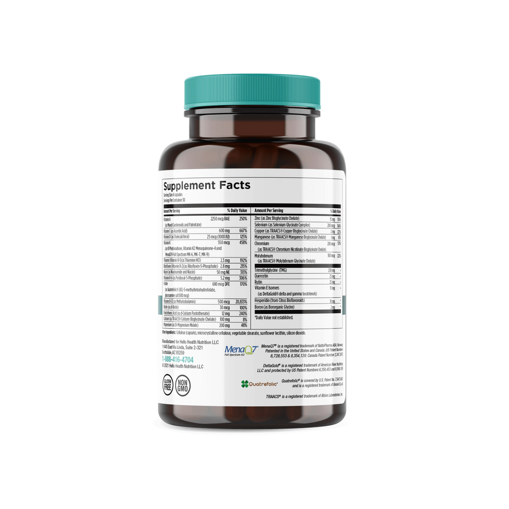 With natural mixed carotenoids, a full spectrum of vitamin K forms, and levels of B vitamins, based on evolutionary intake of these nutrients that support healthy cell replication. This product contains 2 mg of copper, as copper glycinate chelate, a stabilized mineral chelate that reduces the risk of free copper in the body that can cause oxidative stress. This multivitamin is iron-free and iodine-free.