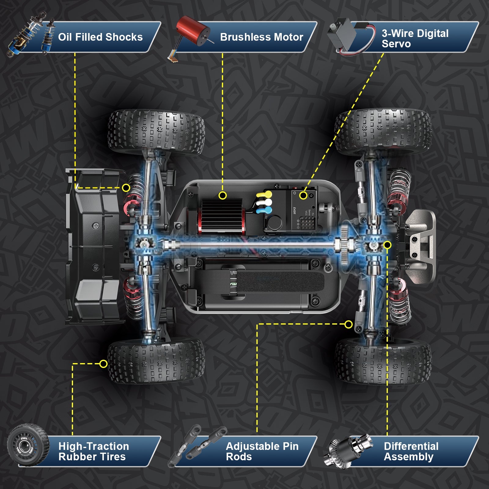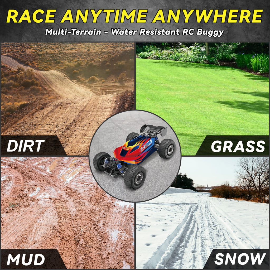 Rugged & All-Terrain Ready: The HC1 Road Rager is designed to handle any challenge with all-metal sealed ball bearings, oil-filled metal shocks, and anti-skid rubber tires. Its tough nylon chassis ensures it's ready to run on sand, mud, or rocky mountain roads.