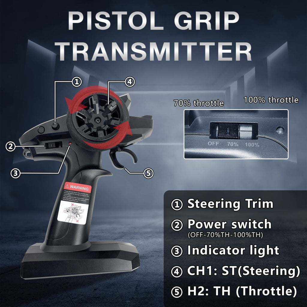 Proportional Throttle & Steering Control: Enjoy smooth racing and precise turning with the pistol grip transmitter featuring proportional throttle and steering. The integrated 2.4GHz technology allows for easy control within a range of up to-150 feet.