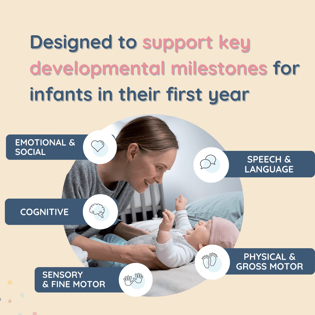 Each activity was thoughtfully designed by our experienced team of pediatricians, therapists, speech-language pathologists, nurses, and more. Each one is carefully crafted to support your baby's growth across five key developmental areas: fine motor skills, gross motor skills, cognitive development, speech and language, and emotional and social skills.