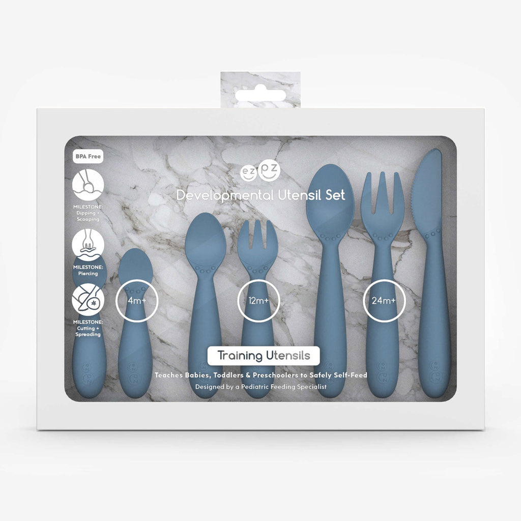 The Developmental Utensil Set provides babies, toddlers and preschoolers with the training tools they need to safely use utensils and self-feed. The developmental system starts with the Tiny Spoons for dipping (4 months +), followed by the Mini Utensils for scooping + piercing (12 months +) and concludes with the Happy Utensils, which layers in knife skills like spreading and cutting (2 years +).