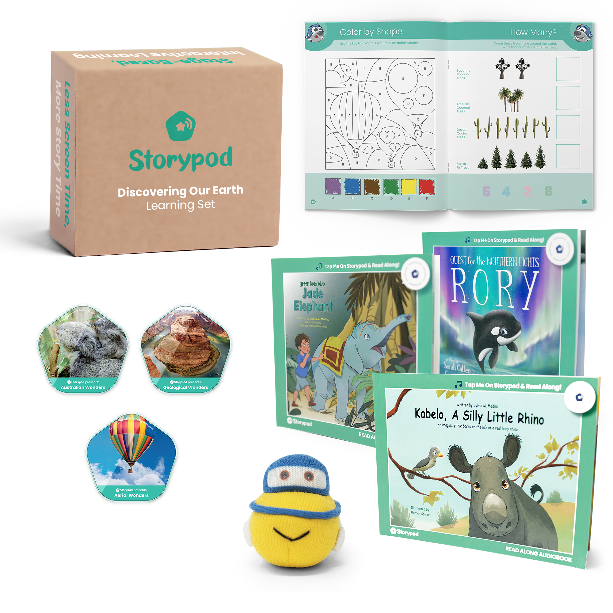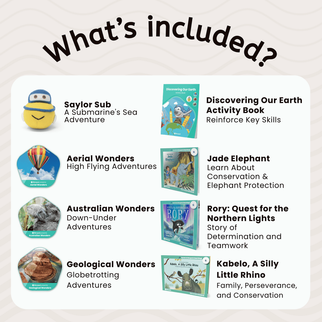 Embark on a global journey with the "Discovering Our Earth" Learning Set. Traverse the "Australian Wonders," get an elevated view with "Aerial Wonders," and unravel the secrets of "Geological Wonders." Through the adventures of Kabelo in the vast African savannah, the Green Kids Club's mission in India, and Rory's quest for the Northern Lights, your child will dive deep into tales of conservation, determination, and friendship. To enhance the experience, an Activity Book is at your child's side, fostering learning and facilitating enriching discussions.