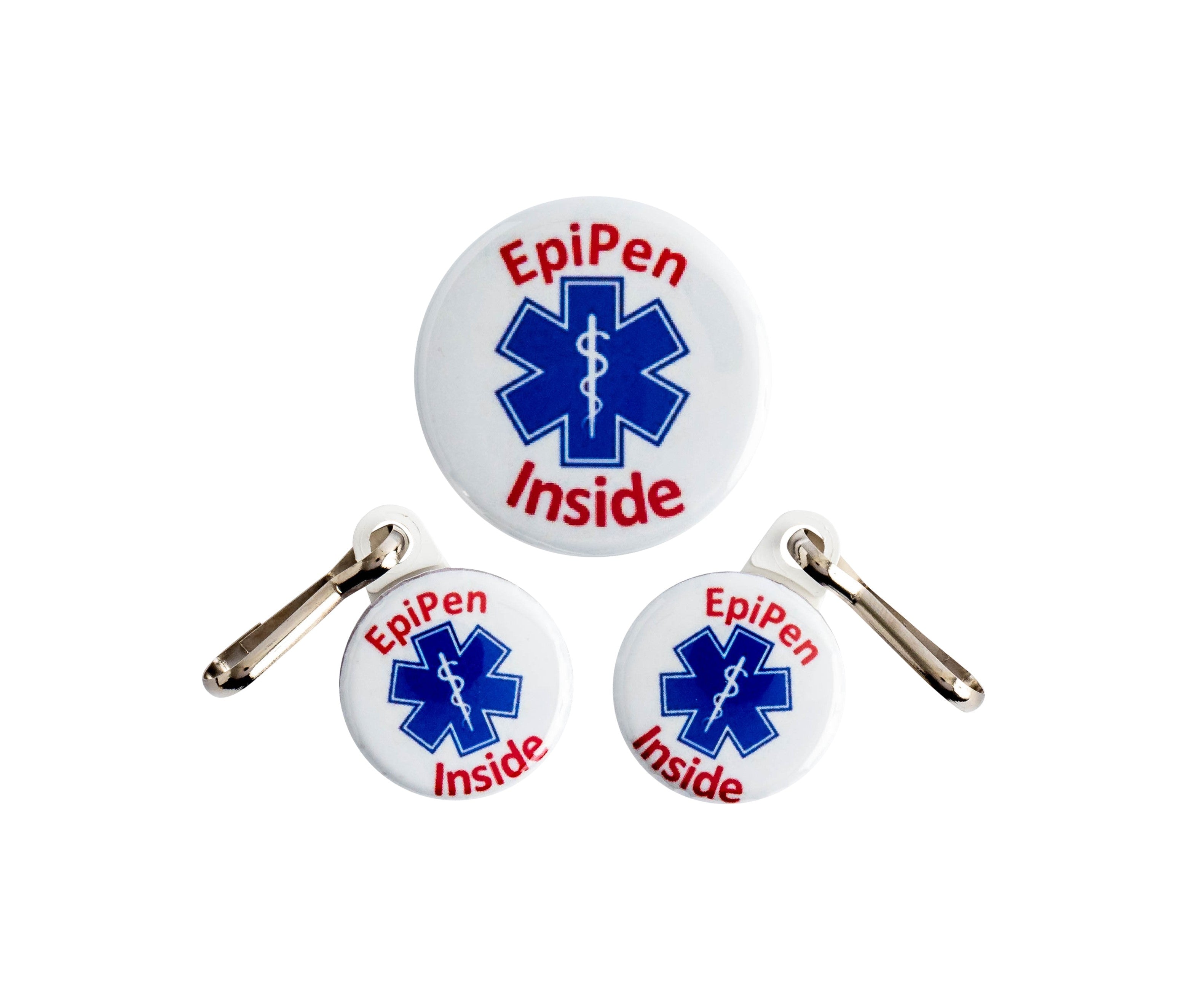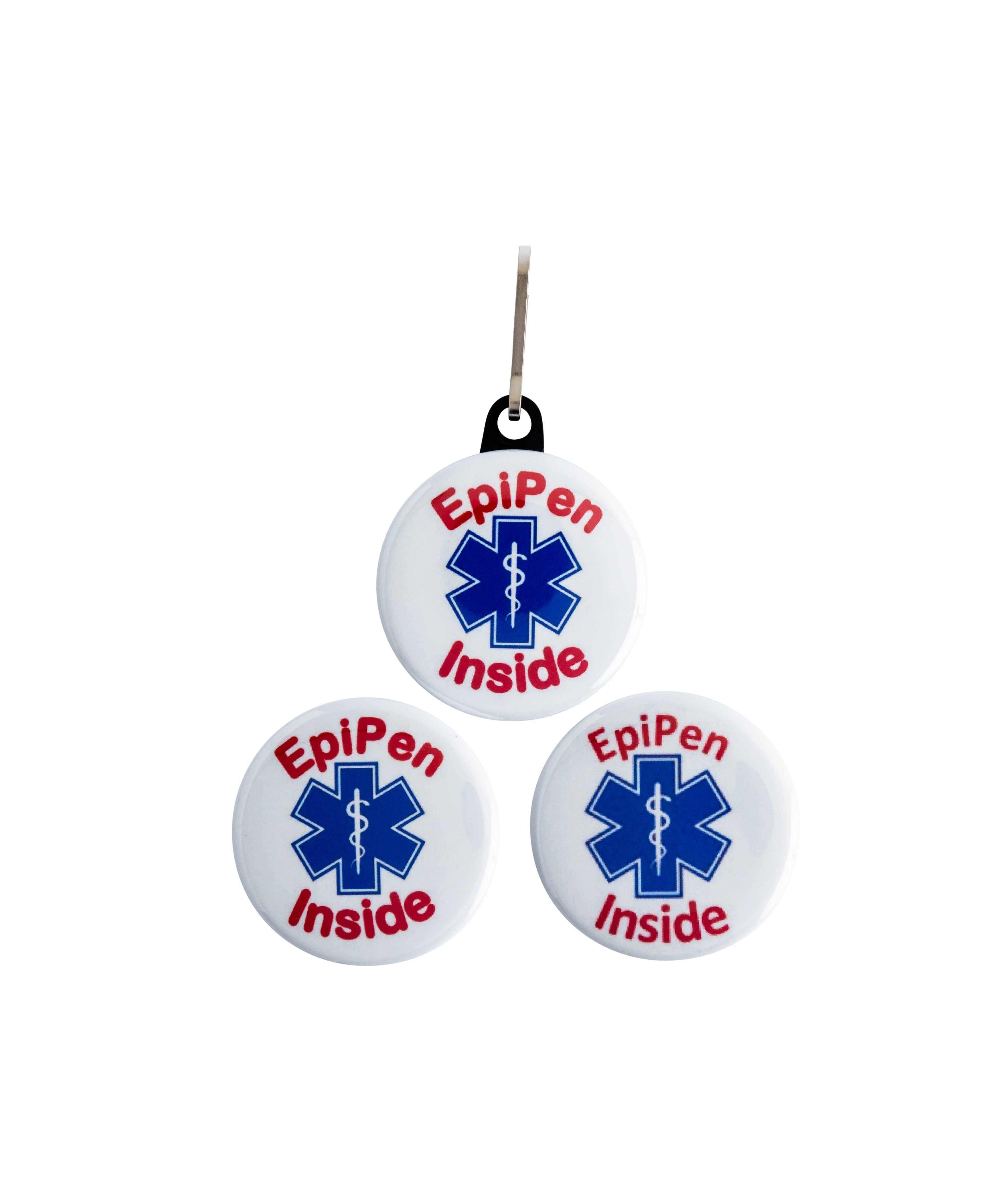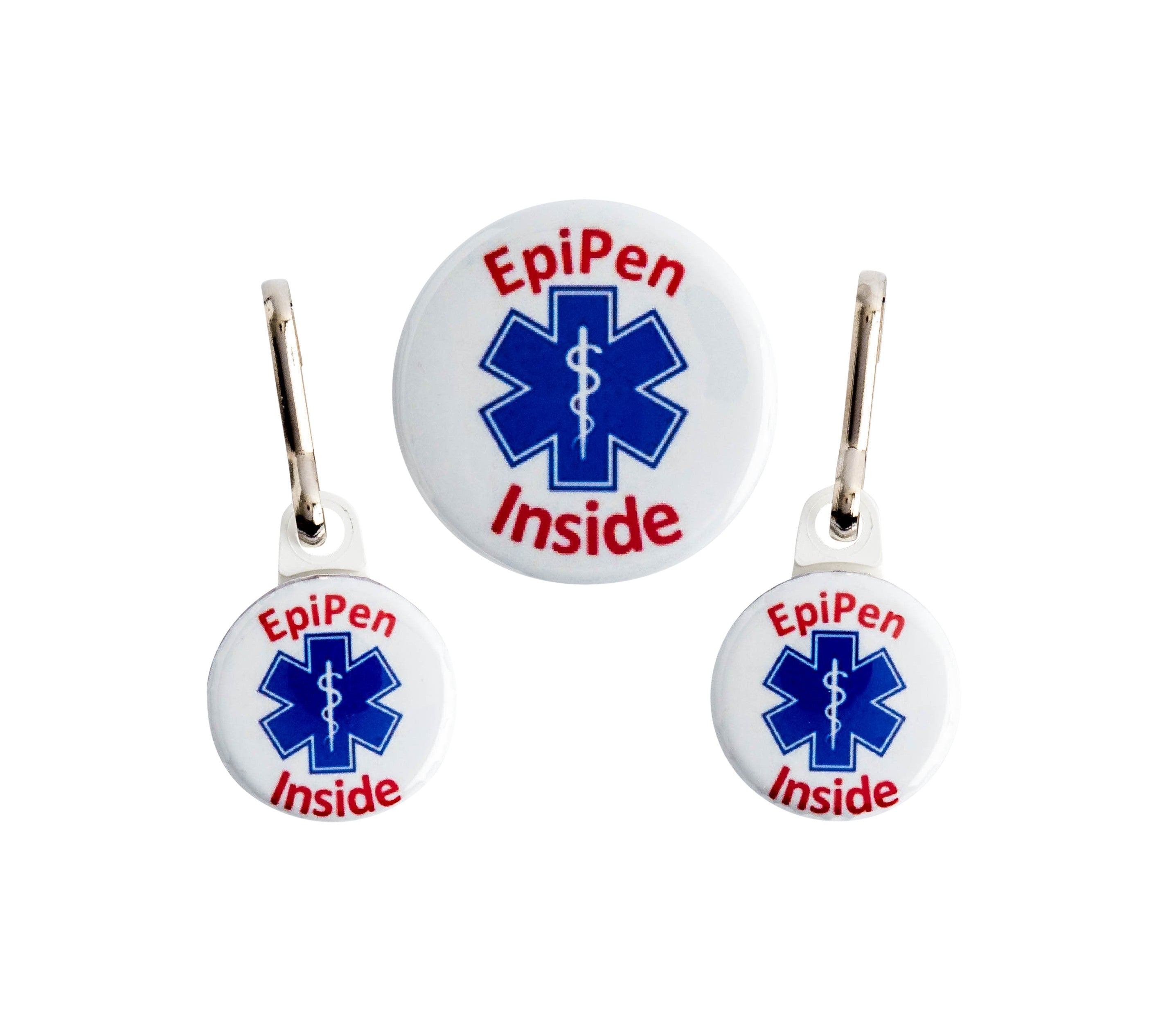 Introducing our Epi Pen Identification Set from Secure ID. We have 2 sets currently available both including pinbacks and clip on zipper pulls. Attach them effortlessly to backpacks, zipper pulls, purses, and more.