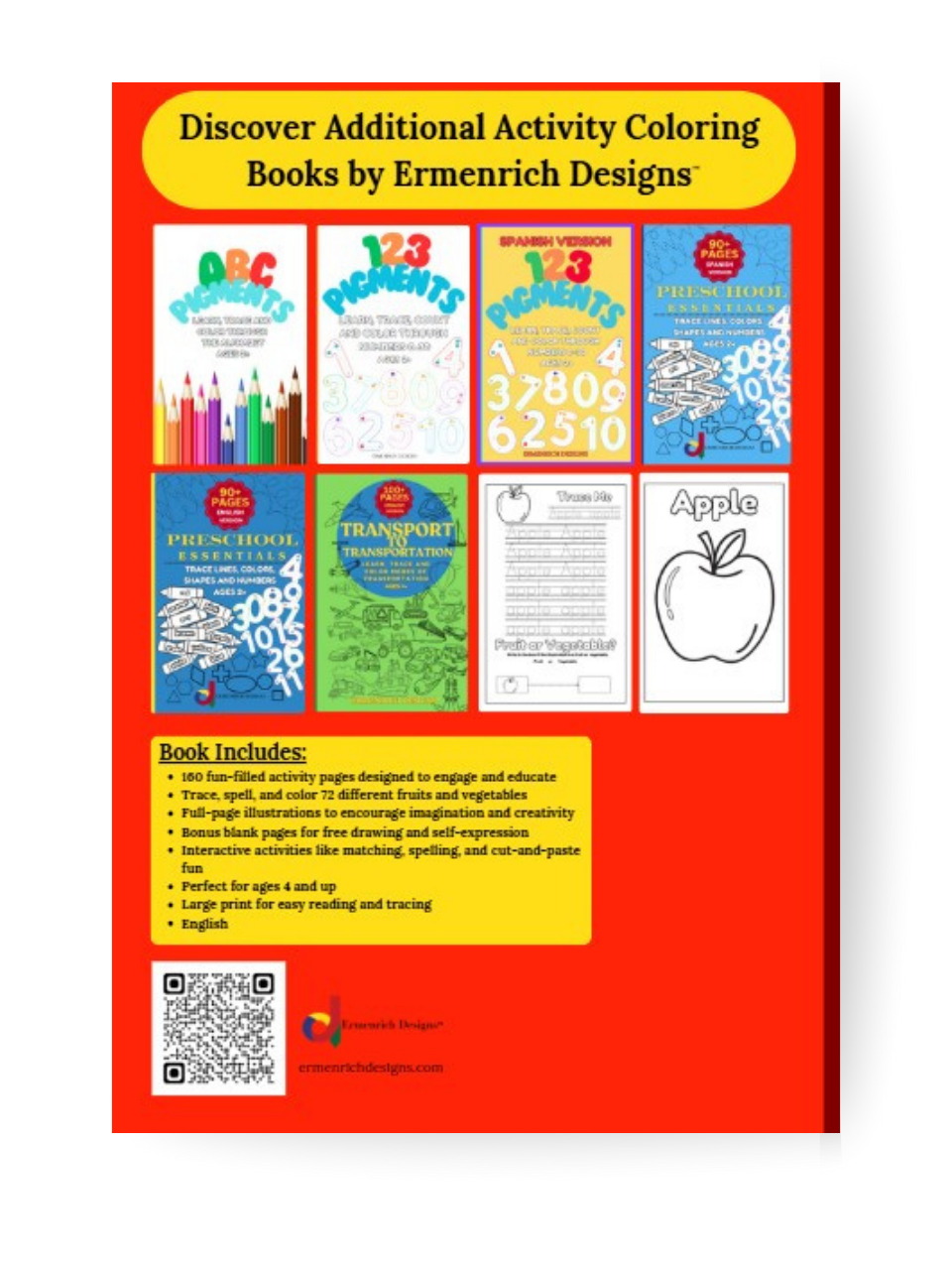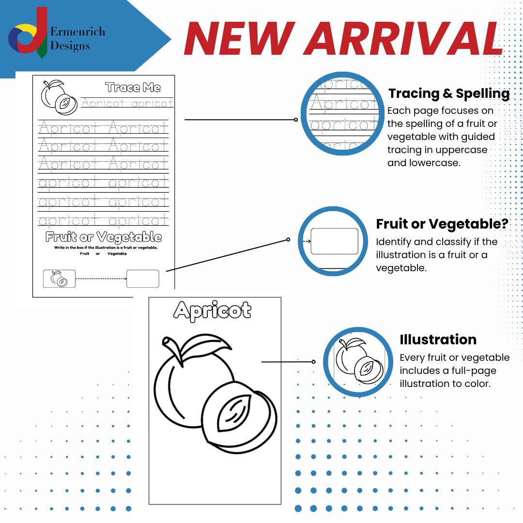 Help your child explore the world of healthy foods with Fruit or Vegetable?, the newest educational coloring book by Ermenrich Designs. Designed for preschoolers and children ages 2–12, this fun and interactive activity book helps children identify, trace, spell, and color over 72 different fruits and vegetables with 160 activity coloring pages.