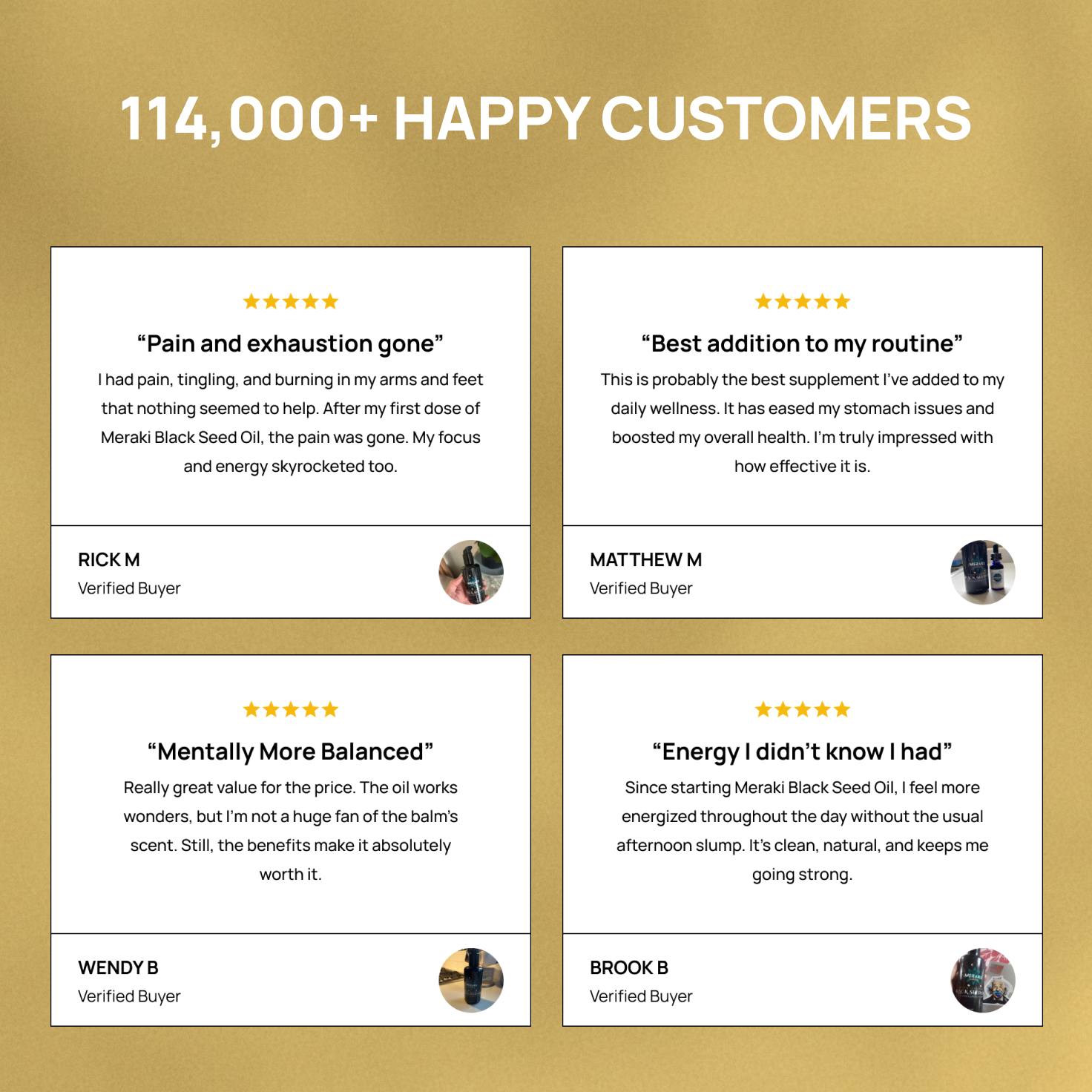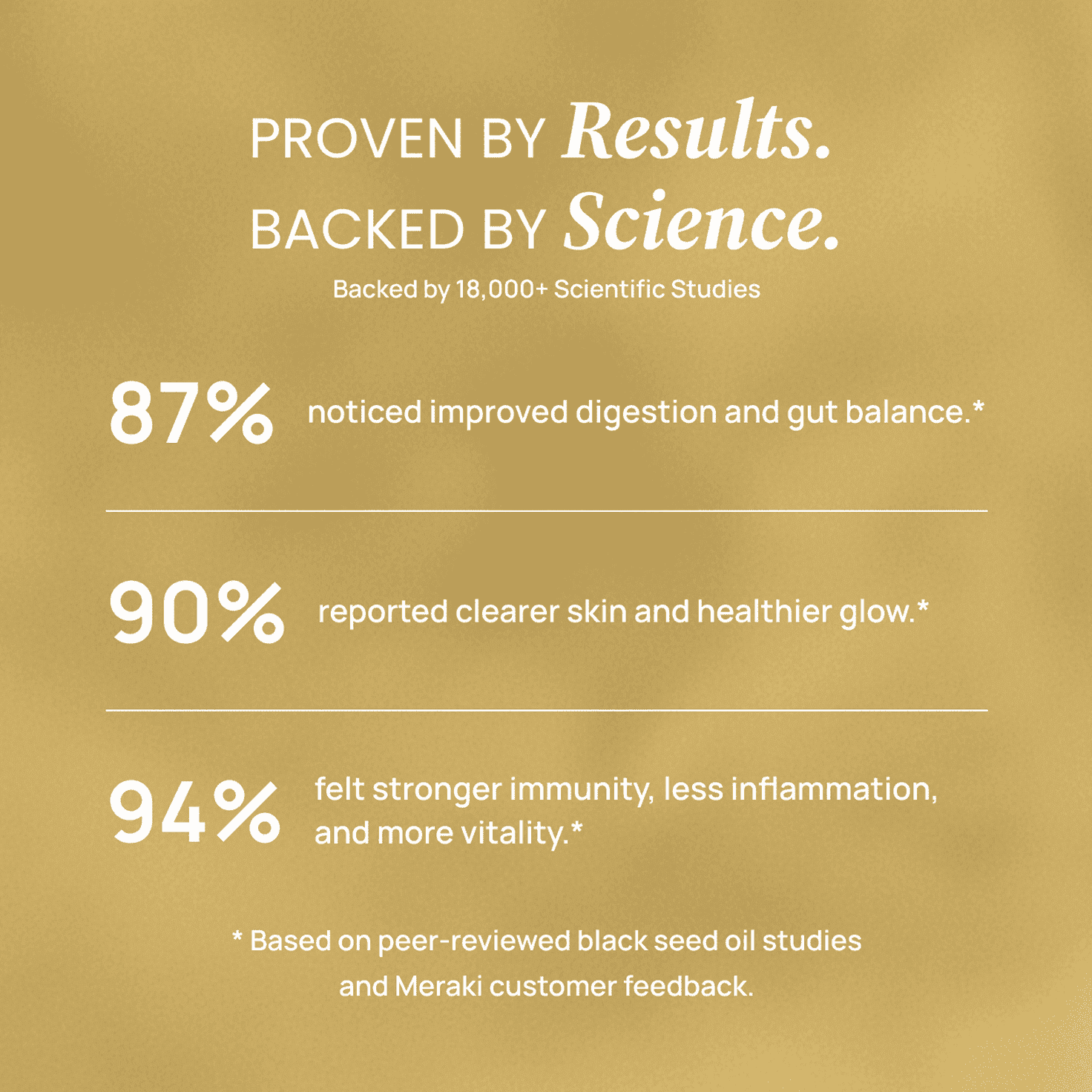 An ancient remedy for skin and digestion issues reborn.  Black Seed Oil's extensive research proves it is the most powerful medicinal oil we have found in nature!  Majority of benefits come from the compound Thymoquinone found in the oil.  This is why we sourced some of the highest potency organic seeds in the world.  Carefully extracted by cold-pressing, and using Miron Glass' patented UV protective technology to sustain freshness, we have bottled one of the freshest sources of Black Seed Oil in the entire world.