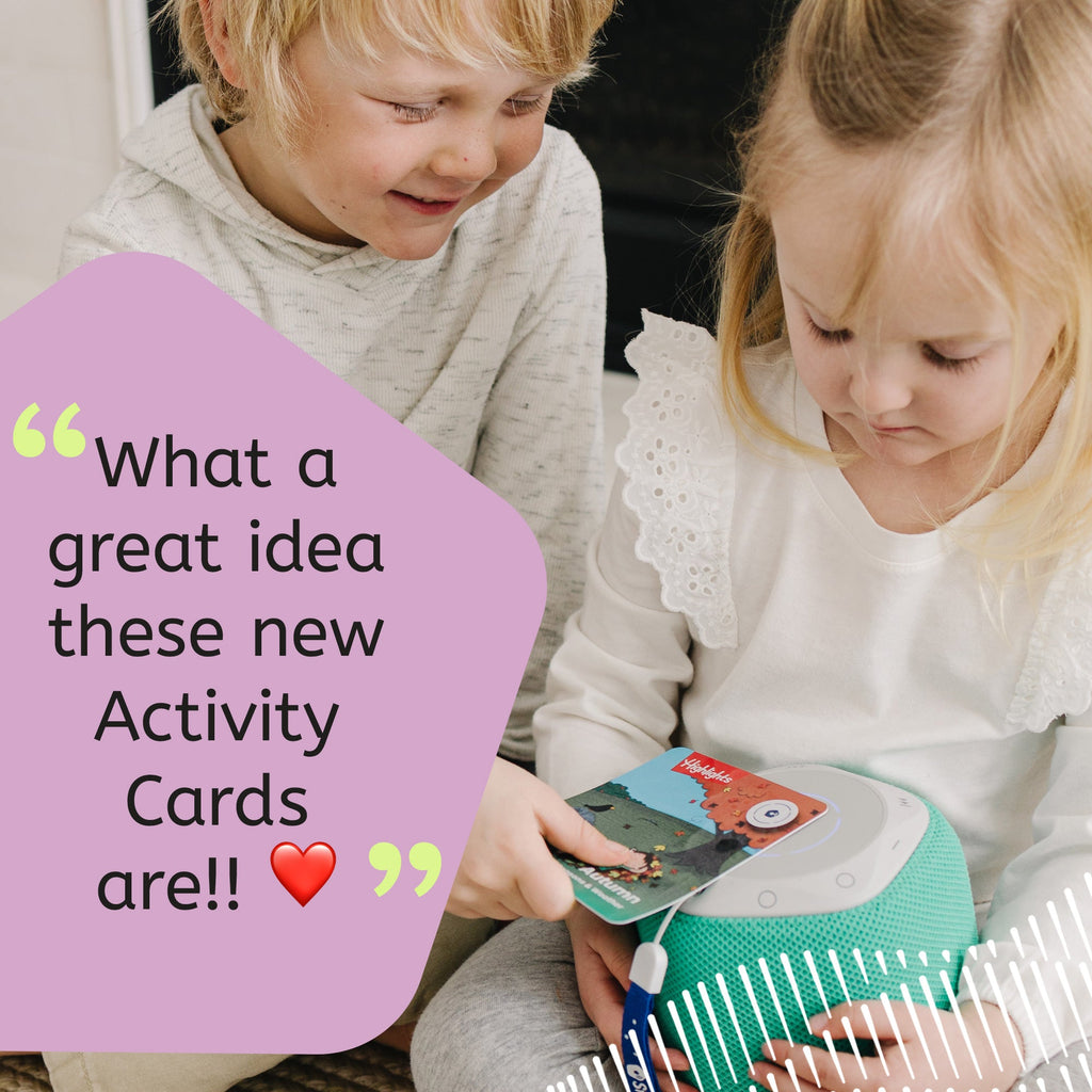 Our activity cards provide children ages 3 - 5 a fun-filled audio experience that inspires them to play and engage through stories, poems, questions, facts, jokes, movement and imagination games. Each card set is comprised of 5 cards.