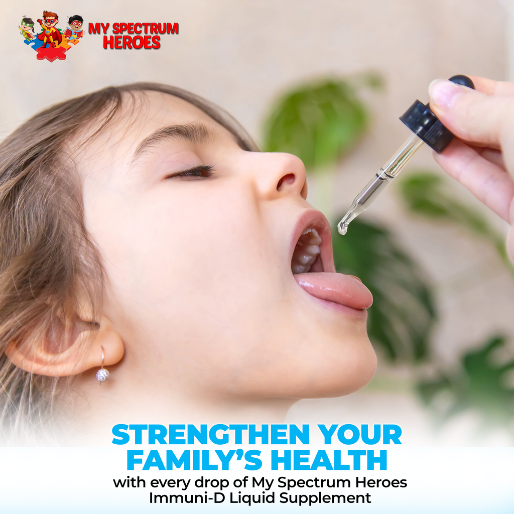 At My Spectrum Heroes, we understand that as a parent, you want nothing but the best for your child. That's why we're excited to introduce IMMUNI-D LIQUID, a high-quality vitamin D supplement designed to support your child's growth, immunity, and overall well-being.