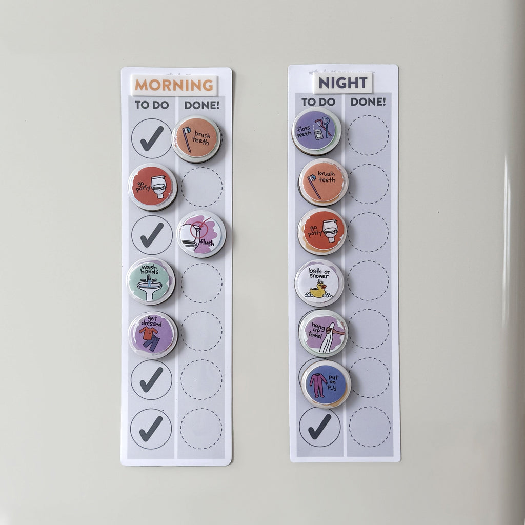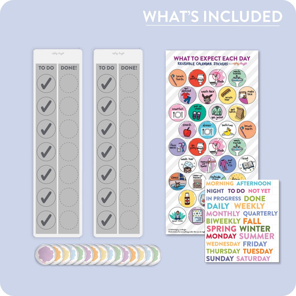 Sheet of 36 total cling stickers, including: Brush Teeth (2), Go Potty (2), Flush the Toilet (2), Wash Hands (2), Get Dressed, Wash Face, Brush Hair, Make Bed, Breakfast, Put on Shoes, Get Jacket, Get Lunch, Snack, Dinner, Bathtime, Floss Teeth, Wash Hair, Hang Up Towel, Put on PJ's, Read, Sleep, Clean Up Messes, Outside Time, Free Play, Medicine, Take Vitamins, Screentime (2), Quiet Time, Special Time, Errands, Game Time