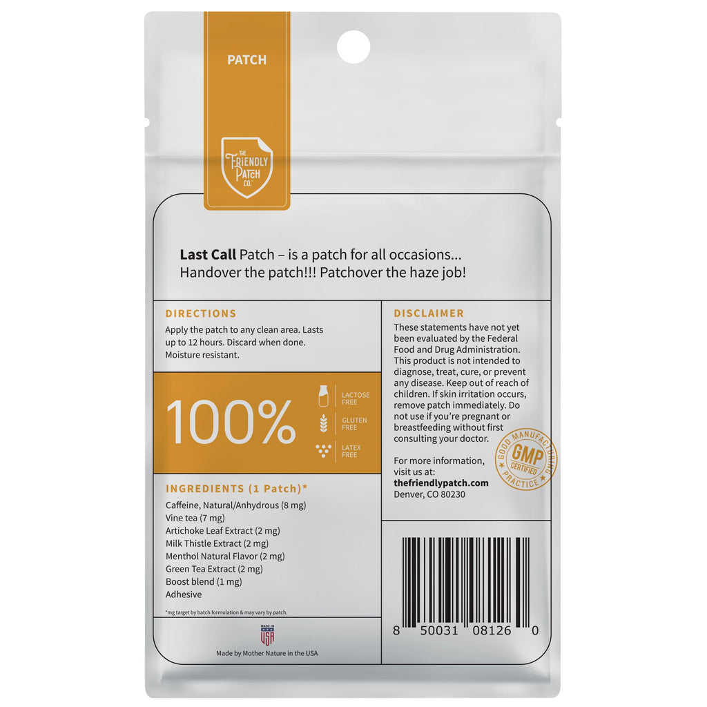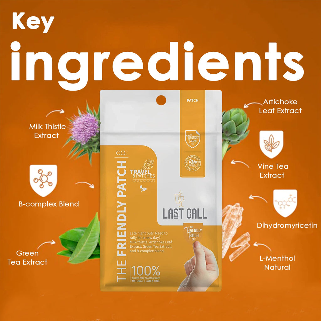 The Last Call Patch from The Friendly Patch is an innovative after-party patch designed to help deal with a night out on the town. This powerful patch contains a unique blend of natural ingredients that work together to support your body after a late night out.