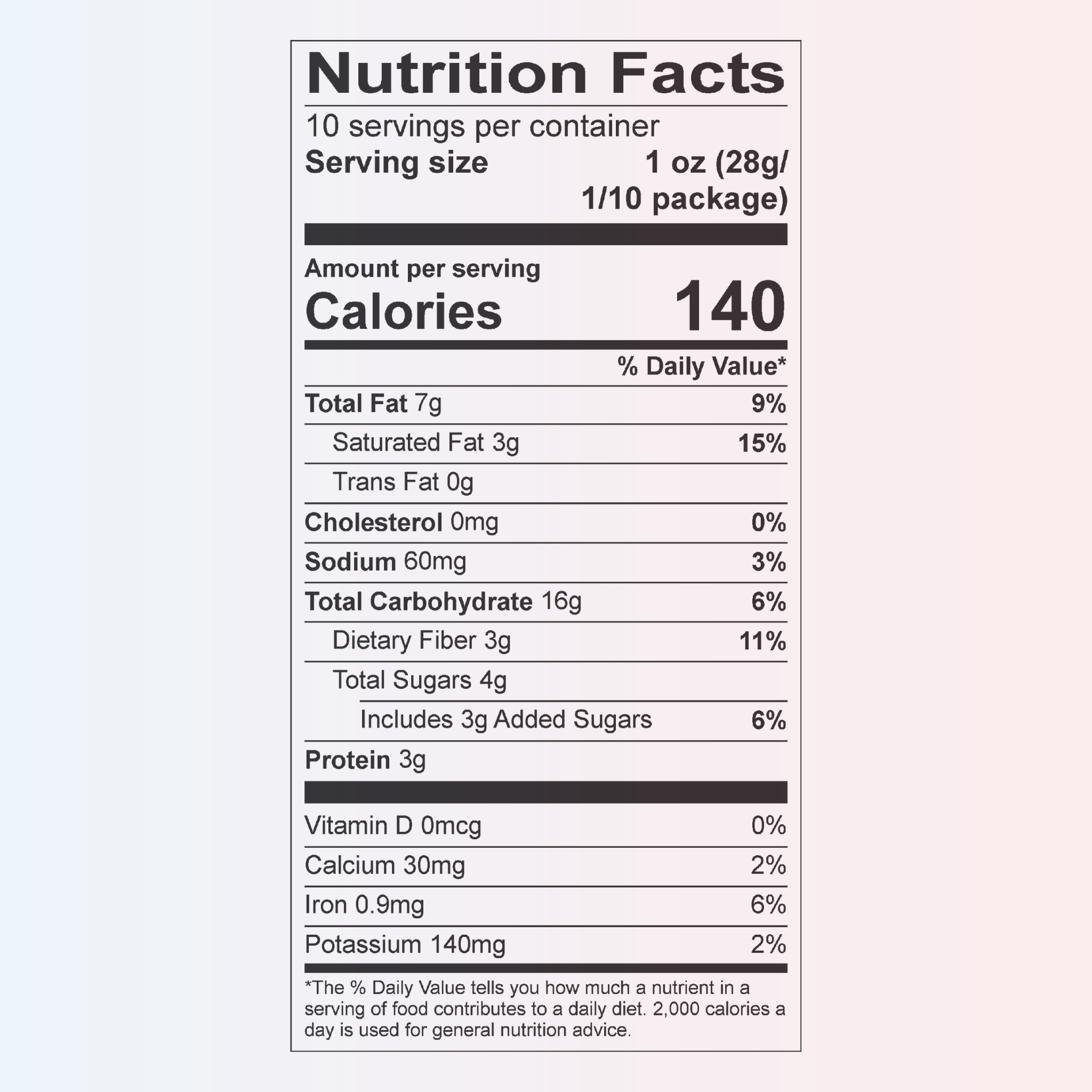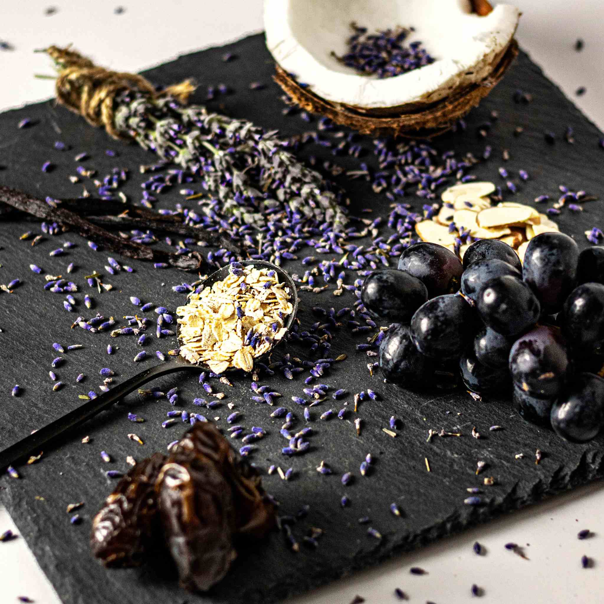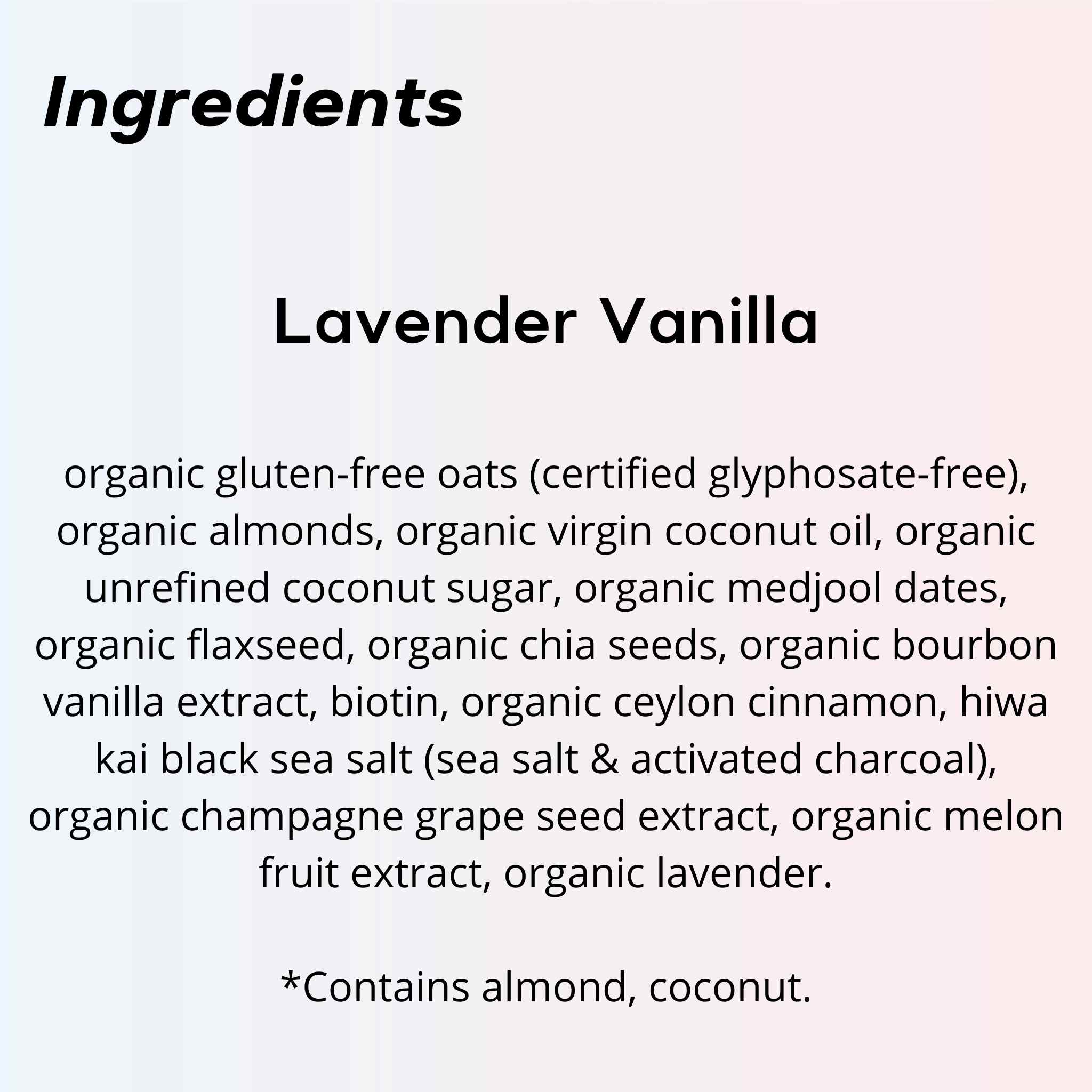 organic gluten-free oats (certified glyphosate-free), almonds, organic virgin coconut oil, organic unrefined coconut sugar, organic medjool dates, organic flaxseed, organic chia seeds, organic bourbon vanilla extract, biotin, organic ceylon cinnamon, hiwa kai black sea salt (sea salt & activated charcoal), organic champagne grape seed extract, organic melon fruit extract, organic lavender. *Contains almond, coconut.