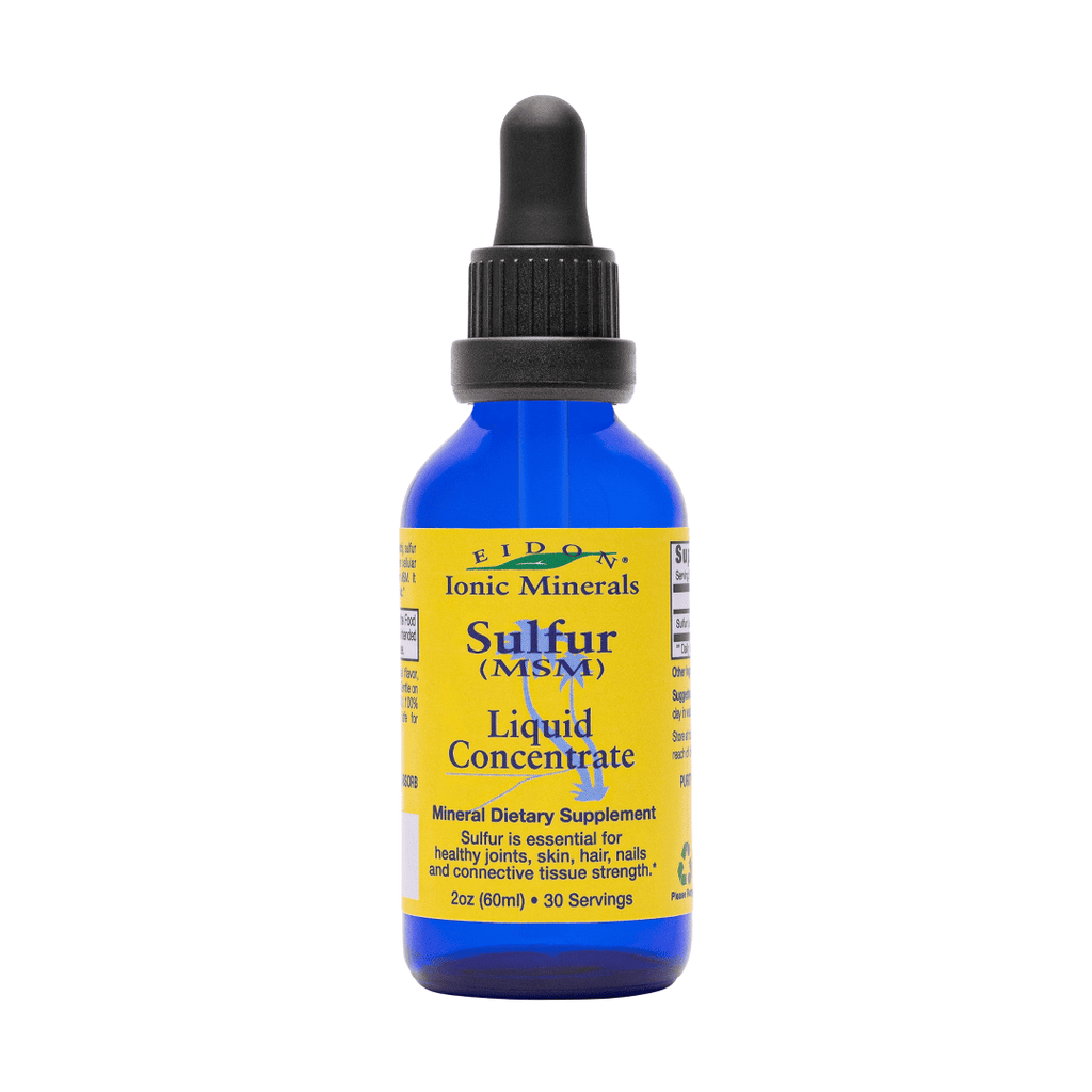 Dietary sources of Sulfur are normally absorbed from the intestinal tract primarily as Sulfur-containing amino acids. Sulfur is present in four amino acids: methionine, cysteine, homocysteine, and taurine. Sulfur is also present in two B vitamins, thiamine and biotin; interestingly, thiamine is important to skin and biotin to hair. Eidon’s Liquid Sulfur is MSM (Methylsulfonylmethane), which is the organic form of Sulfur and is absorbed quickly after ingestion, bypassing normal food absorption channels. Excess amounts are eliminated from the body.