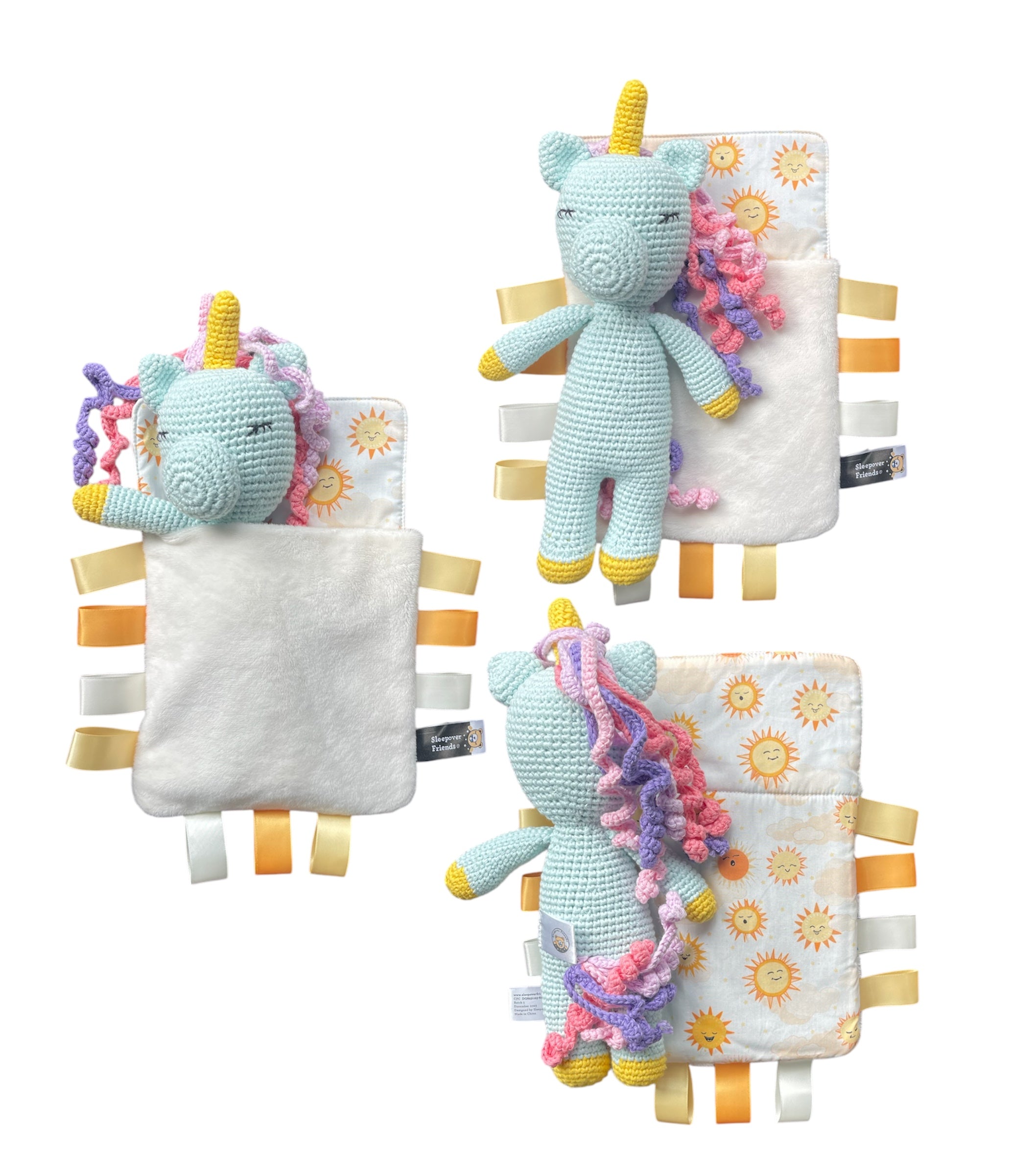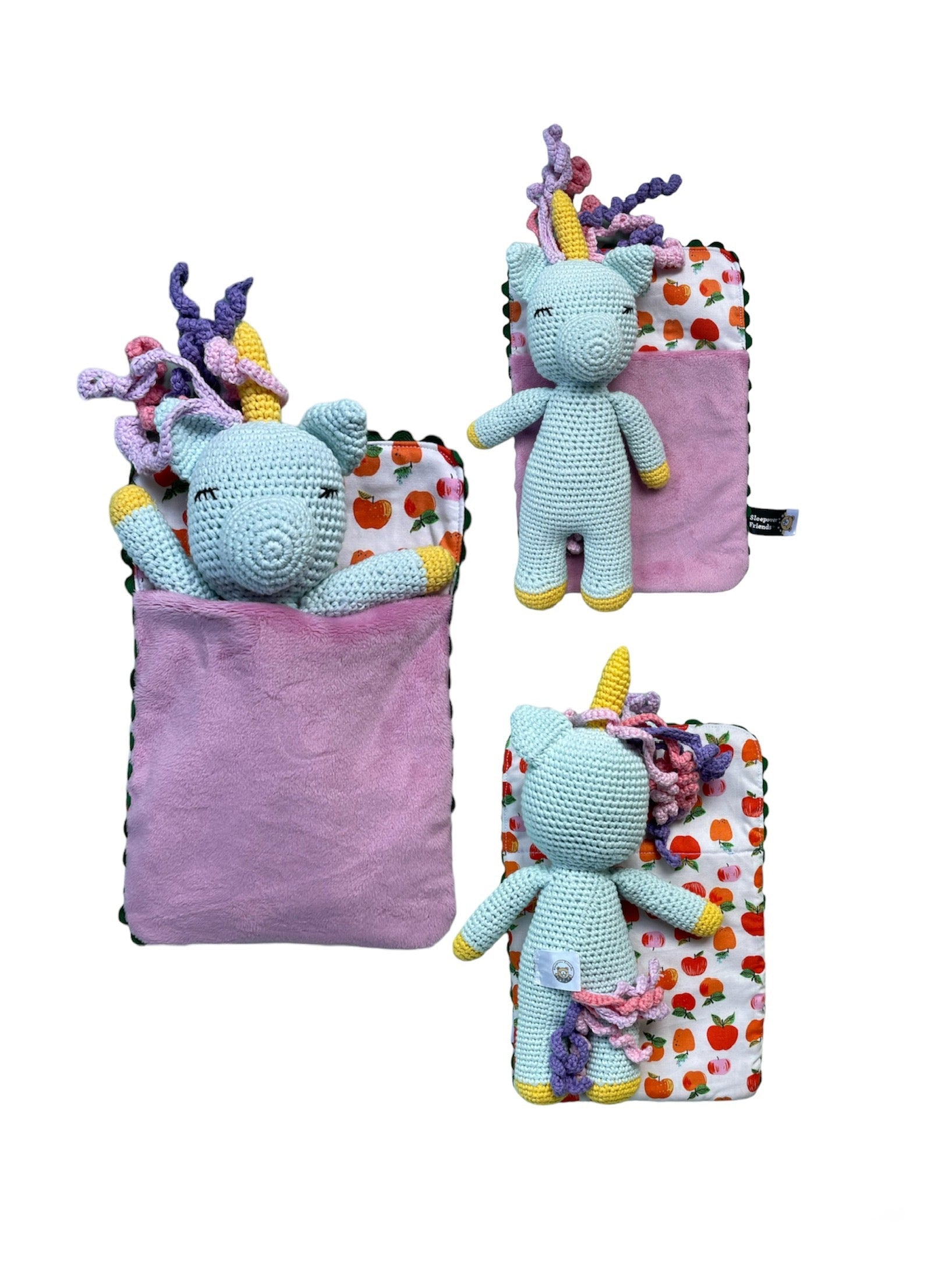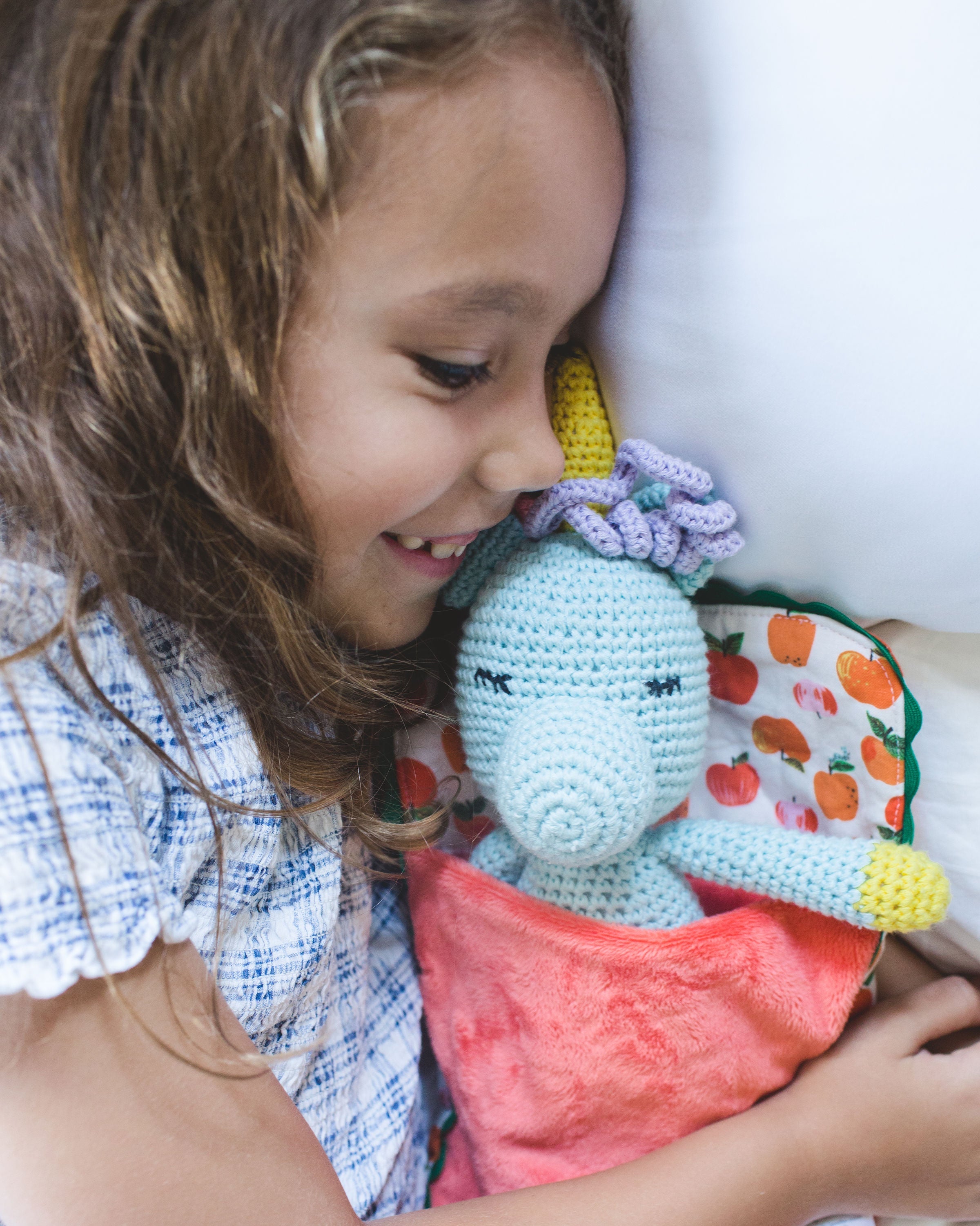 Sleepover Friends are handmade with %100 cotton yarn and polyester cotton fill; measures 9 inches by 4 inches (not including the horn). All friends are third party tested and have Children's Product Certificate (CPC) to ensure they are safe for newborns and children; imported, designed by Sleepover Friends.
