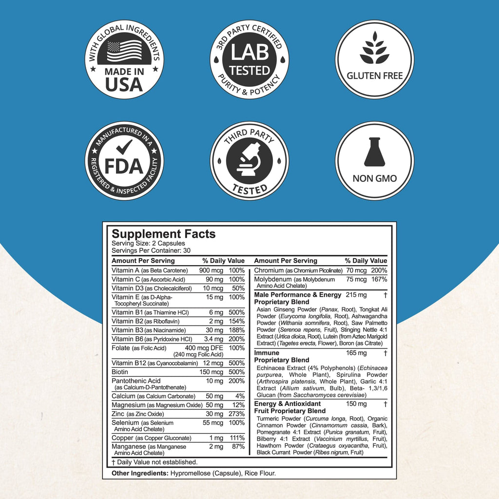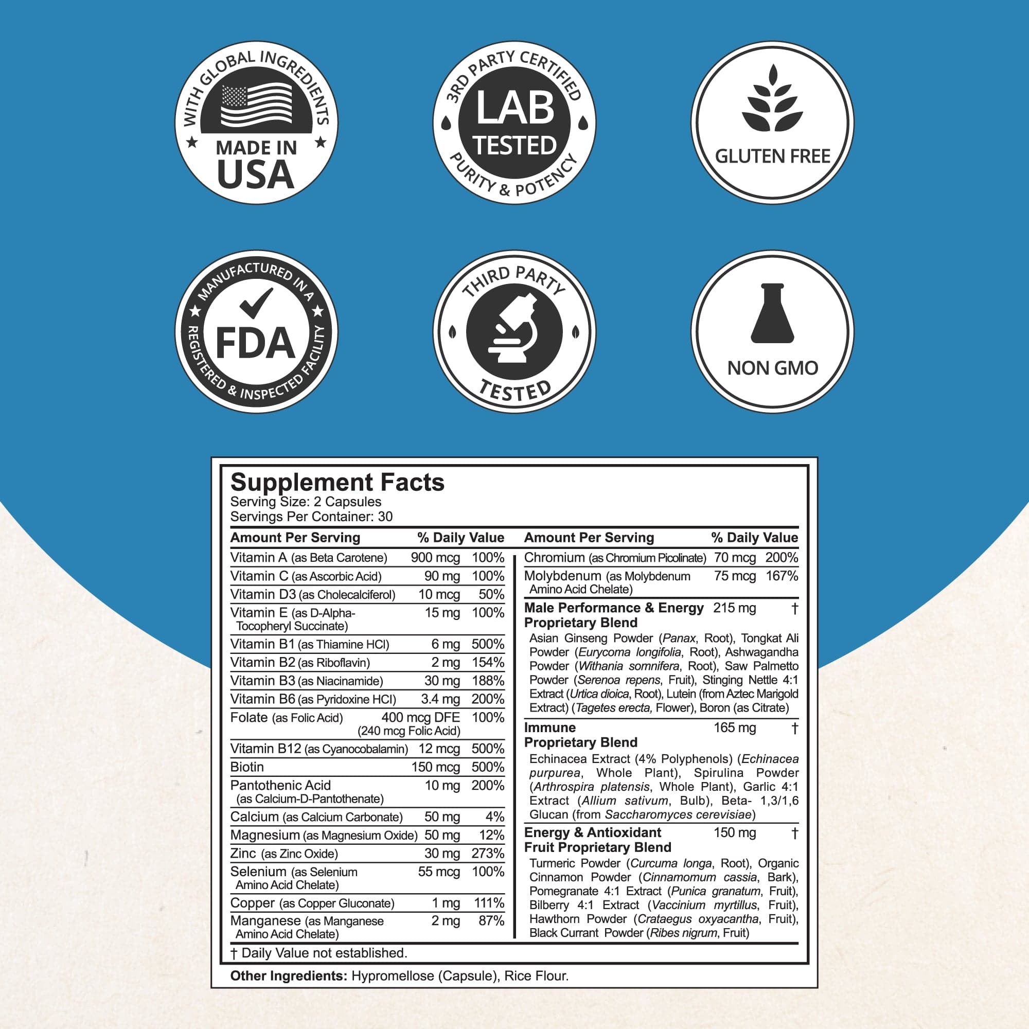 When leading a busy lifestyle, it is difficult to maintain a healthy and balanced diet. Our multivitamin for men combines 20+ vitamins and minerals to complement your meals and fill in any gaps. The all-in-one formula is also fortified with three proprietary blends of herbs and fruits, helping active men thrive and tackle each day head-on.*