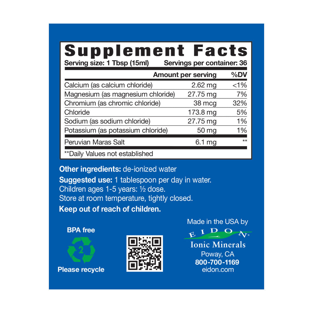 Electrolytes truly are the “Spark of Life”. While many of the known elements can be classified as Electrolytes, there are five elements recognized around the world as essential for maintaining a properly functioning electrical circuit within our body. Magnesium, Potassium, Sodium, Chloride and Calcium. Eidon's Electrolytes blend also includes Chromium for the proper management of sugar.