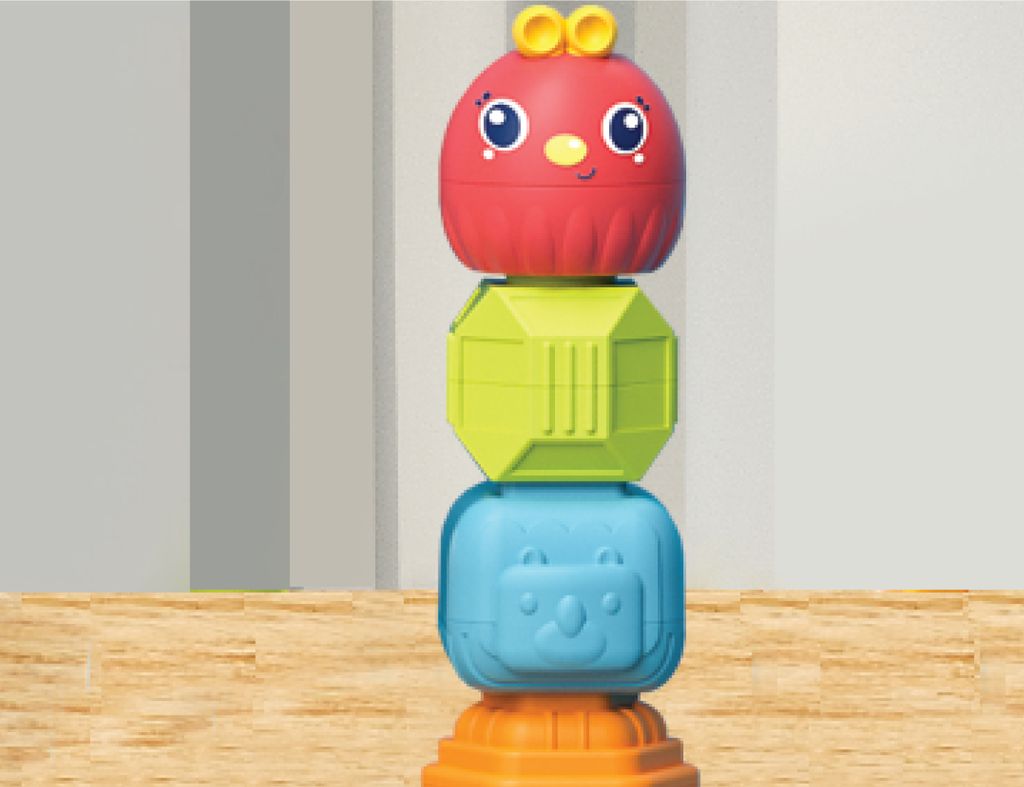 · Shape Stacking – Match the raised shape ends with cutout shape ends to create a stack. Shake the stack to create different sound variations.