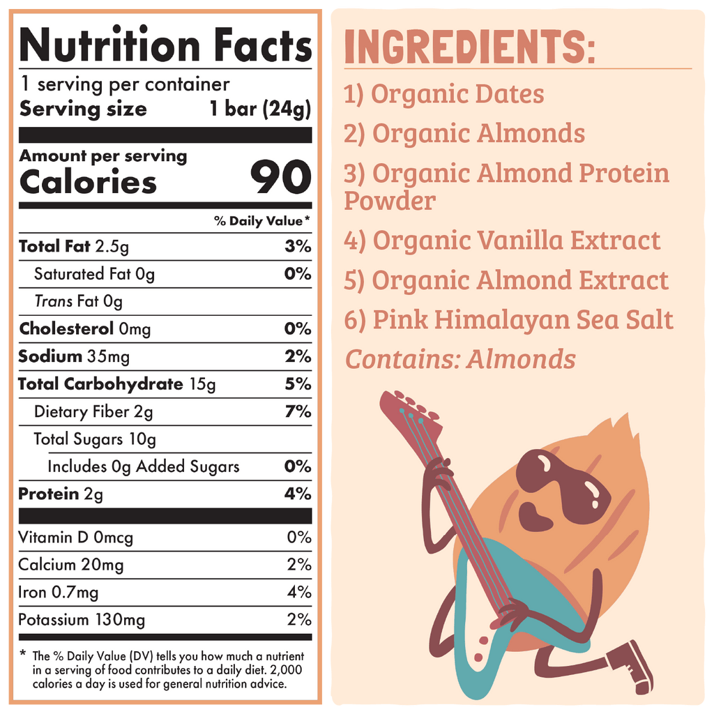 Ingredients: Organic Dates, Organic Almonds, Organic Almond Protein Powder, Organic Vanilla Extract, Organic Almond Extract, Pink Himalayan Sea Salt. Contains: Almonds.